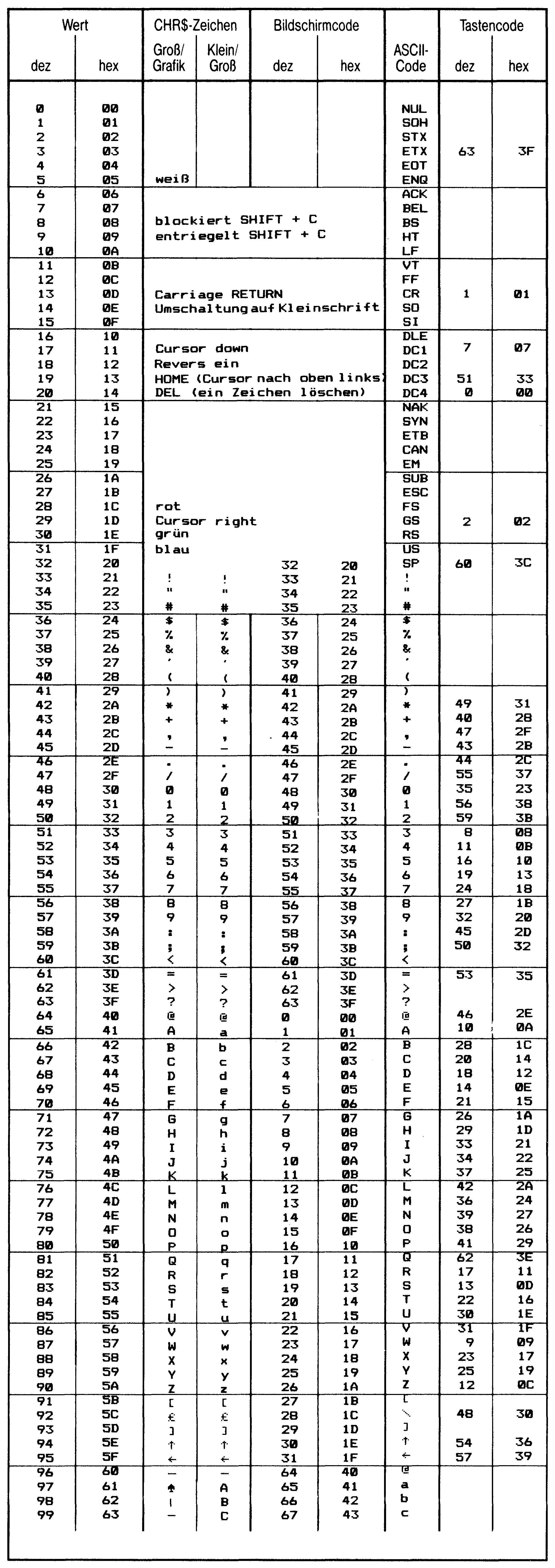 Die kompletten ASCII-, CHR$- und Bildschirmcodes und dazu noch die vollständigen Tastencodes des C 64 finden Sie in der folgenden Tabelle anwenderfreundlich, also so, daß man sie auch benutzen kann, gegenübergestellt.