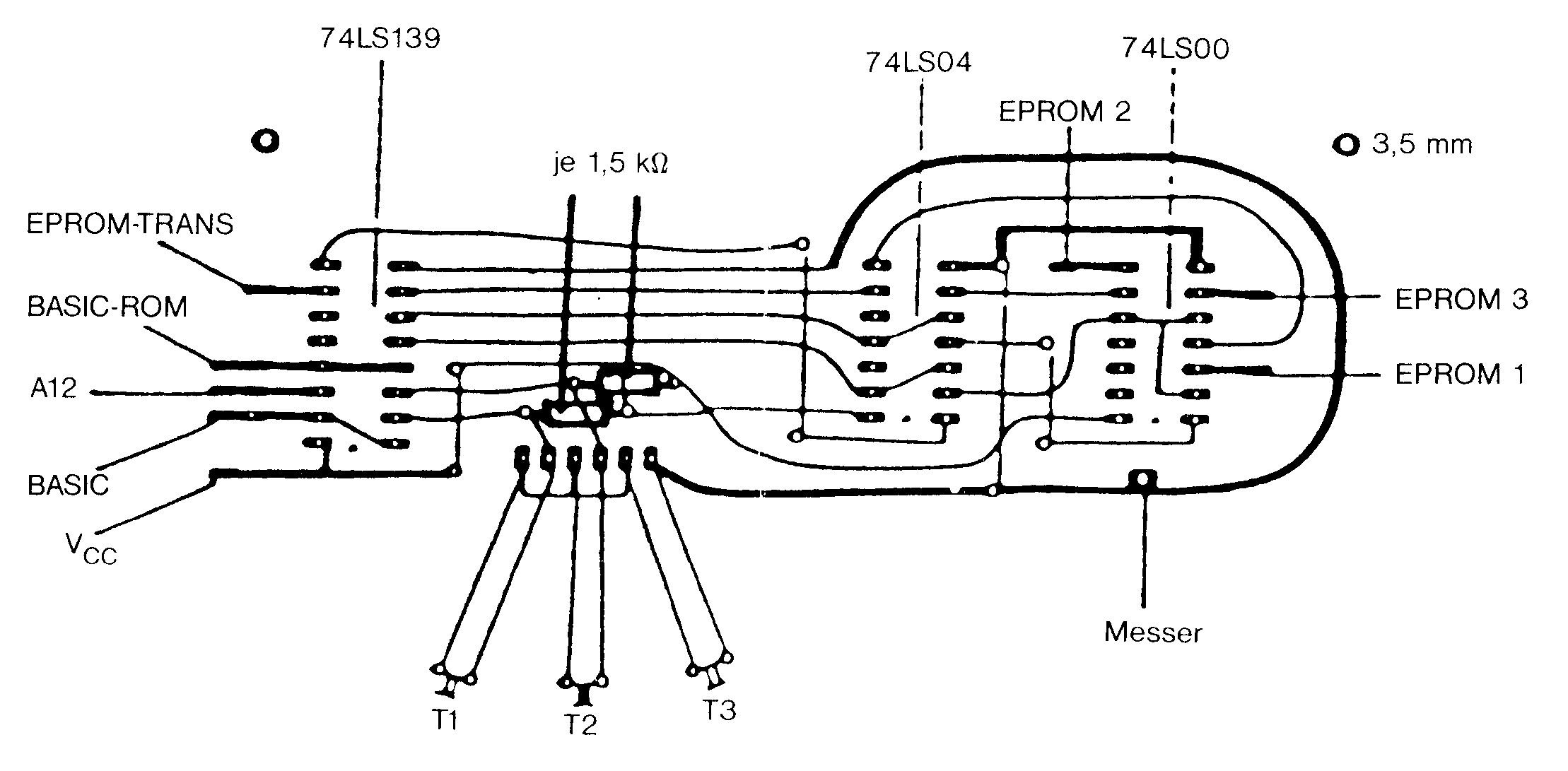 Verwendet man das hier abgebildete Platinenlayout, so müssen EPROM 1 bis 3 vom Typ 2532 sein, EPROM-Trans vom Typ 2716. Hier sollten wir noch einmal einen Blick auf Bild 5 werfen: Bis auf die CE-Anschlüsse, die zur Zusatzplatine geführt werden, sind die Leitungen fest mit den des Kernal-ROMs verdrahtet (also Adreß- und Datenbus). Die restlichen epromspezifischen Anschlüsse (OE, Vpp, PRG) werden je nach Typ für EPROM-Lesen fest auf low oder high gelegt. Die Stromversorgung liegt beim Kernal an den Pins 12 (Masse) und 24 (Vcc = 5V); A12 entspricht Pin 21.