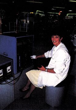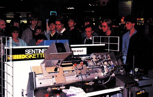 Anläßlich der »belgischen Wochen« wurde im Horten-Computer-Center erstmals in einem Kaufhaus die Fertigung von Disketten vorgenommen. Hierzu hat die Firma Sentinel aus Belgien entsprechende Maschinen mitgebracht, bei deren Aufbau allerhand Probleme gemeistert werden mußten. Eines war die fehlende Staubfreiheit der Luft, die im Werk zu bestimmten Arbeitsgängen gewährleistet ist, im Warenhaus aber unmöglich einzuhalten ist. Ein anderes Problem war die Kühlung der Falzmaschine, die das Disketten-Jacket (Hülle, in der die magnetisch beschichtete Plastikscheibe steckt) verschließt und verschweißt. Mit einem genialen wie einfachen Trick bekamen die Mitarbeiter von Horten und Sentinel auch das Kühlungsproblem in den Griff, so daß man die großen Kühlmaschinen in Belgien stehen lassen konnte.