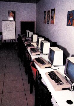 Ein anderer Service, den Horten anbietet, sind Computerkurse für Basic-Anfänger und Fortgeschrittene. Die Gebühr für die sechsstündigen Kurse betragen 39 Mark. Die sechs »Schulstunden« werden auf drei Tage verteilt. Auch Samstagskurse sind inzwischen geplant. Als Schulungsgeräte werden C 64 verwendet. Einen Blick in das Düsseldorfer Schulungszimmer, das sich 20 bis 22 Schüler teilen, zeigt Bild 4.