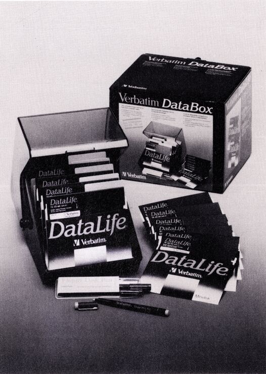 In einer »DataBox« bietet Verbatim zehn Disketten an, die 100%-fehlerfrei sein sollen. Zwei Ausführungen stehen zur Verfügung: Single Sided/Double Density (48 tpi) oder Double Sided/Double Density (48 tpi). Die durchschnittliche Lebensdauer soll 30 Millionen Datenzugriffe pro Spur betragen. Die »Data-Box« (Bild) ist eine Kunststoffbox zur Aufbewahrung von bis zu 50 5,25-Zoll-Disketten. Sie ist mit fünf beweglichen Registern und Anti-Rutsch-Füßen ausgestattet. Zusätzlich enthält die »DataBox« drei Schreibstifte für Disketten.