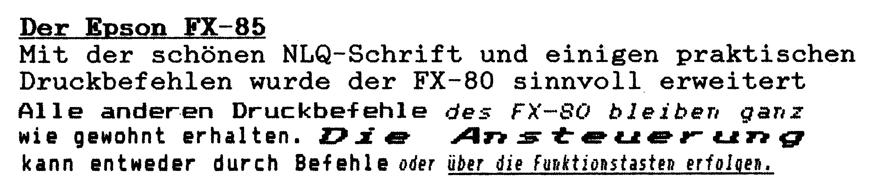 Der FX-85 unterscheidet sich mechanisch nur unwesentlich vom FX-80. Er besitzt ebenso neun Nadeln und druckt die Zeichen der Normalschrift in der bekannten 9x11-Matrix. Schaltet man jedoch in die Schönschrift, so wird die Matrix, wenigstens rechnerisch, zu einer 18x18-Matrix. Dieser Punktevorteil wird durch einen nicht unerheblichen Geschwindigkeitsnachteil (37 gegenüber 160 Zeichen pro Sekunde, Probetext in 1:43) erkauft. Im Gegensatz zu seinem Vorfahren besitzt der FX-85 einen Pufferspeicher von acht KByte. Damit erreicht er bereits Dimensionen, ab denen sich ein Pufferspeicher bezahlt macht. Beim Arbeiten, beispielsweise mit einer Textverarbeitung, kann man mit der Texteingabe weitermachen, obwohl der Drucker noch den letzten Ausdruck beendet.