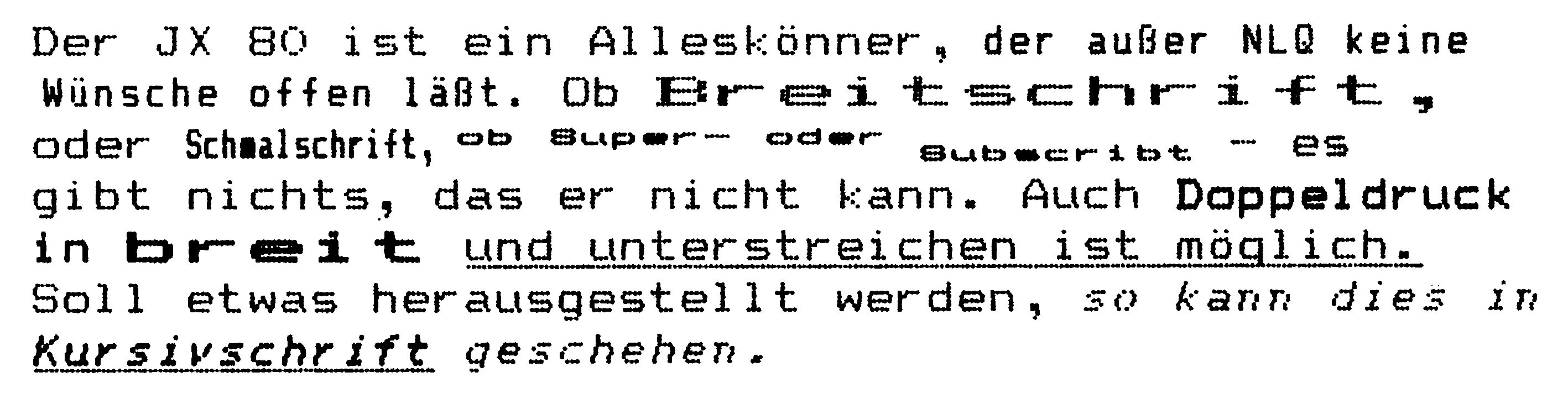 Doch wer glaubt, nun seien die Möglichkeiten der Programmierung erschöpft, sieht sich getäuscht. Eine große Zahl von Formatanweisungen sind einsetzbar. So kann der linke und der rechte Rand gewählt werden. Vertikale und horizontale Tabulatoren und auch das Anspringen der Tabulatoren im Text, wird mittels ESC-Befehlen möglich. Die Seitenlänge ist in Zeilen oder Inch wählbar und der Zeilenabstand ist fast stufenlos einzustellen. Der sogenannte Bit-Image-Modus ist das Geheimnis der hochauflösenden Grafik des JX-80. Mit normaler, doppelter, und sogar vierfacher Dichte kann der JX-80 Grafik darstellen — und das in Farbe. Dabei variiert die Anzahl der Punkte je Zeile zwischen 480 und 1920.