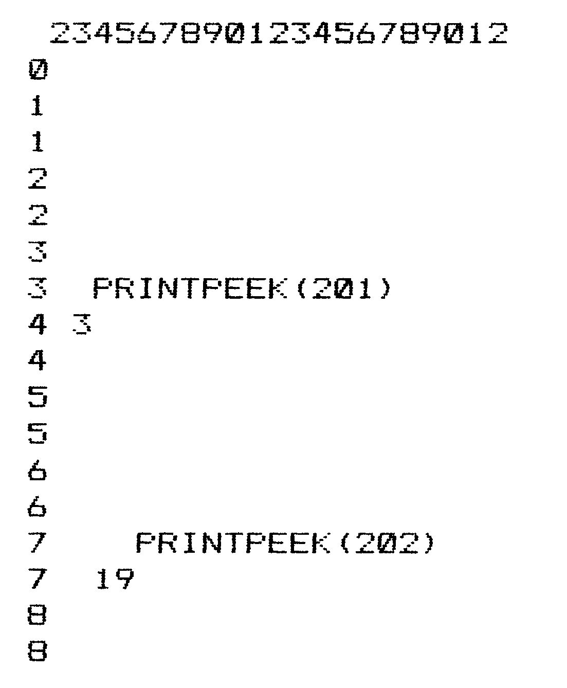 Diese beiden Speicherzellen werden bei GET und INPUT verwendet, um die Zeile und Spalte des letzten Zeichens einer eingegebenen Zeile festzustellen. Die Spalten (in Zelle 201 angegeben) zählen von 1 bis 40 (1 bis 22 beim VC 20). Die Zeilen (in Zelle 202 enthalten) zählen dagegen in Paaren von 0 bis 12, identisch mit der bei Zelle 200 erläuterten »logischen« Zweierzeile. Da dies nicht ganz einsichtig ist, gebe ich einen Bildschirmausschnitt wieder (Bild 1), der den Sachverhalt verdeutlichen soll.