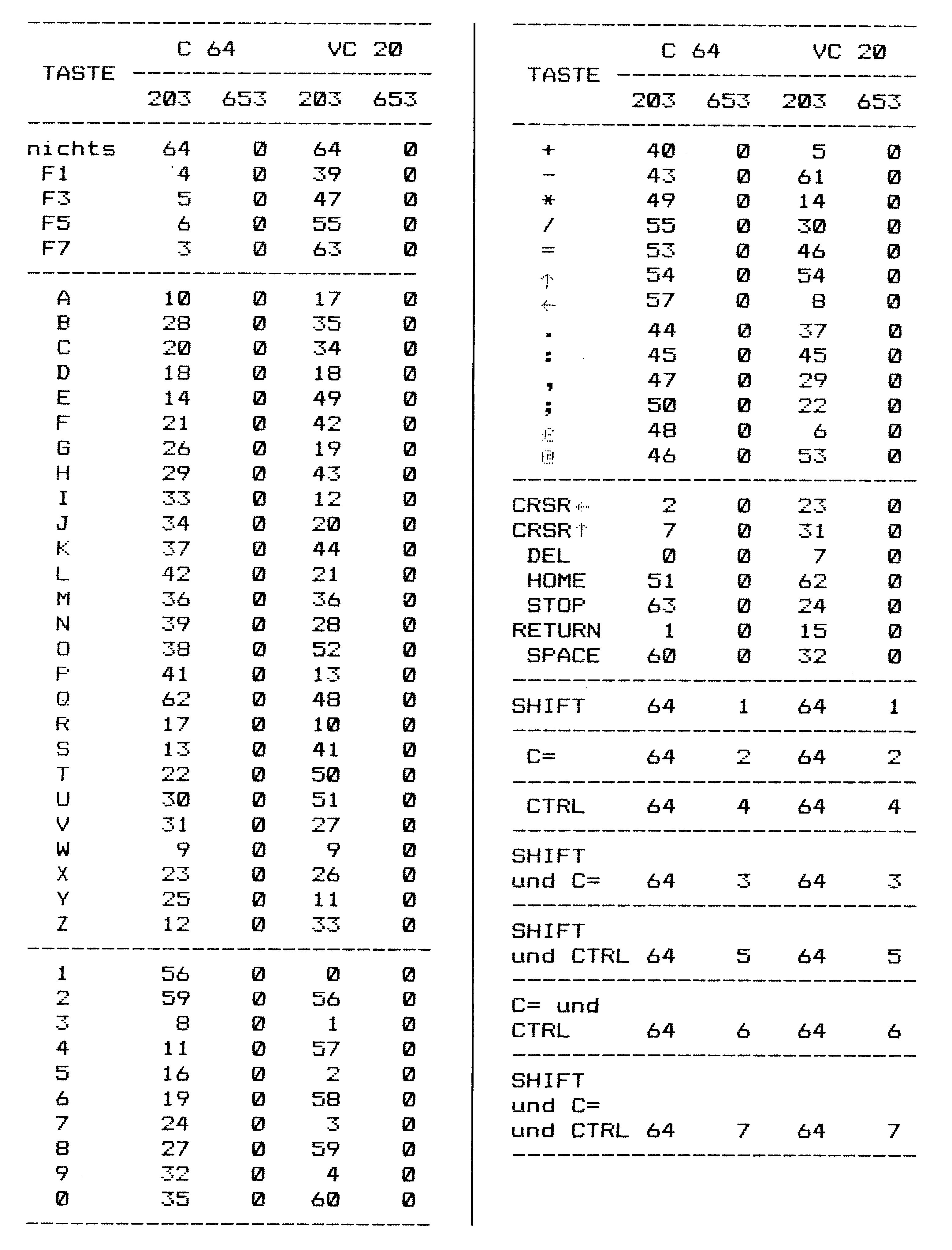 Tabelle 1 gibt Ihnen die volle Übersicht. Wenn Sie sich die Mühe machen, die Zahlenreihen der Zelle 203 auf Vollständigkeit zu prüfen, dann werden Sie feststellen, daß vier Zahlen fehlen. Es sind die Werte, die eigentlich den vier Steuertasten CTRL, C = , rechte und linke SHIFT-Taste zugewiesen sind. Aber wie gesagt, sie werden gleich nach 653 umgeleitet, wobei allerdings kein Unterschied mehr zwischen der linken und rechten SHIFT-Taste gemacht wird.