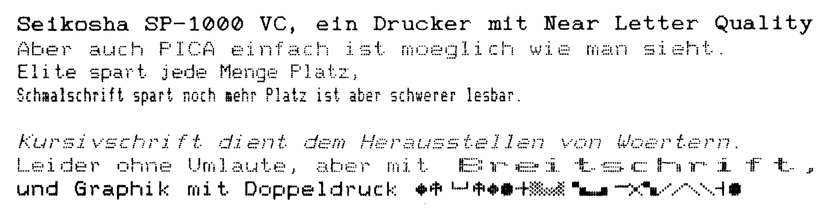 Doch so gut sich diese Fähigkeiten auch anhören mögen, man wird vom SP 1000 VC rasch wieder auf den Boden der Realität zurückgeholt. Die vorgenannten Leistungsmerkmale lassen sich allesamt nur über Sekundäradressen an- beziehungsweise auswählen. Von einer Textverarbeitung aus ist da so gut wie nichts einzustellen. Beinahe vergessen sind da die fehlenden Umlaute.
