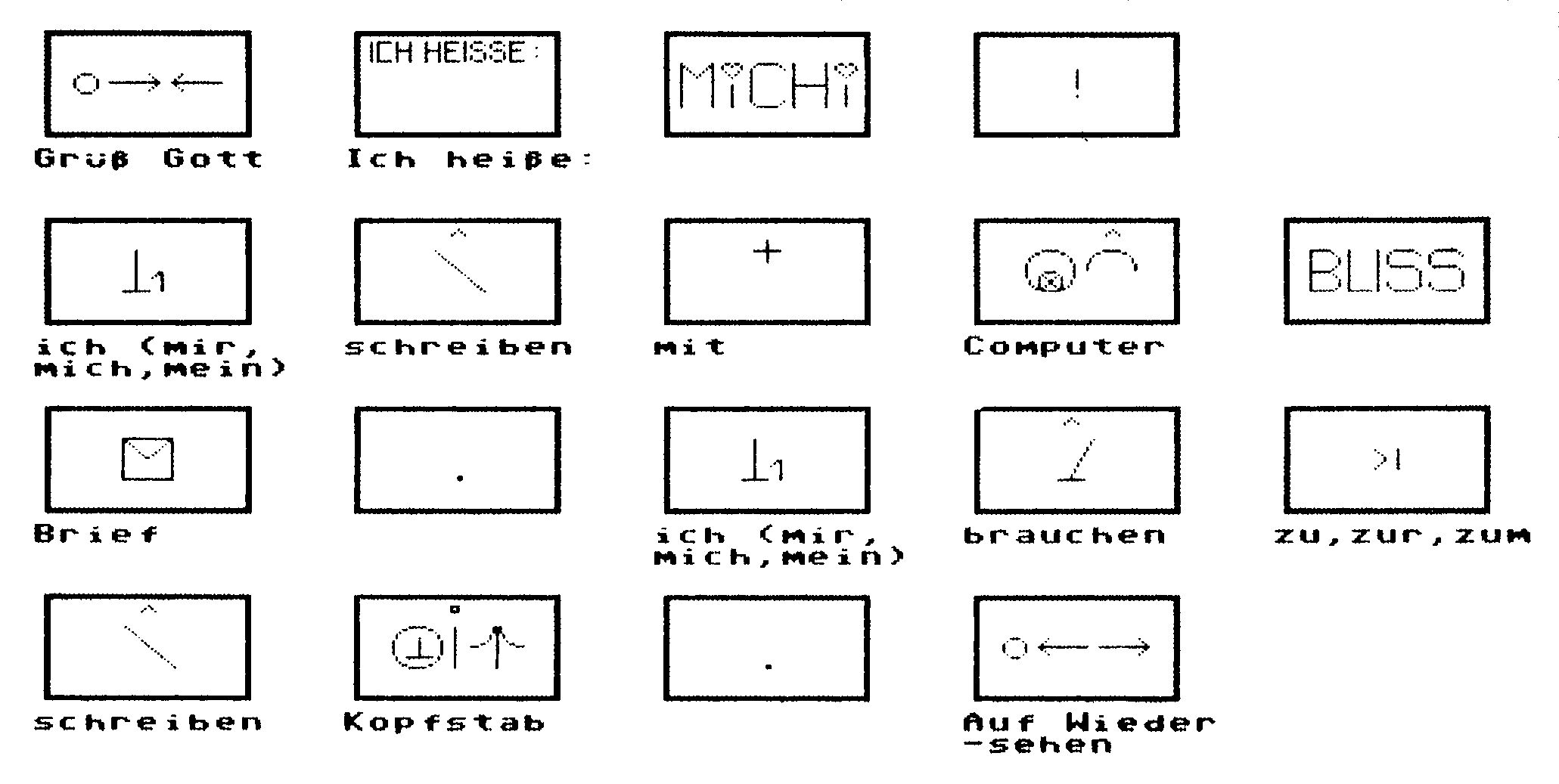 Es gibt ein paar Ansätze in dieser Richtung, doch sind elektronische Spezialanfertigungen so teuer, daß schon allein der Preis Planungen zunichte macht. Im Juni 1985 begannen Mitglieder des Computer Club Graz, zusammen mit Lehrerinnen der »Landessonderschule für körperbehinderte und mehrfach behinderte Kinder«, die internationale nonverbale Kommunikationssprache »Bliss« auf Computer umzusetzen. »Bliss« wird nicht verbal gesprochen, sondern bildlich dargestellt und gezeigt. Menschen mit cerebralen Lähmungen, die nicht sprechen können, haben keine Möglichkeit, sich aktiv an Gesprächen zu beteiligen. Kommunikation beschränkt sich auf das Stellen von Fragen wie »Willst Du essen?« oder »Willst Du trinken«, in Zusammenhang mit Zustimmungs- beziehungsweise Ablehnungsgesten. Gefühle können überhaupt nicht genauer artikuliert werden. Die Symbolsprache Bliss wurde vom Österreicher Karl Blitz (Charles Bliss) bereits 1949 entwickelt und seit 1975 vom »Blissymbolics Communication Institute« des »Ontario Crippled Children's Centre«, Kanada, weltweit verbreitet. Die Zeichen sind etwa mit dem Prinzip der chinesischen Schriftbildsymbole zu vergleichen. Sie sind aus einer geringen Anzahl von Einzelelementen zusammengesetzt und so logisch aufgebaut, daß sie leicht im Gedächtnis behalten werden können. Um es auch Symbolunkundigen zu ermöglichen, die Bedeutung zu verstehen, ist unter jedem Begriff die Übersetzung geschrieben. So wird aus dem Zeichen »Mann« und »Schutz« der »Vater«, der »Rock« macht das Zeichen zur »Frau« und weiter zur Mutter. Obwohl die Sprache etwas holprig klingt, werden die Anwender zu einer grammatikalischen Sprache geführt, was durch die syntaxgemäße Anordnung der Symbole auf der Tafel und ihre unterschiedliche Färbung erreicht wird. Zeitwörter werden grün, Hauptwörter rot, Eigenschaftswörter blau dargestellt. Für viele Kinder oder auch Unfallopfer ist das die erste Möglichkeit, sich zu artikulieren. Sei es nun, daß sie mit der Hand oder einem Kopfstab auf das entsprechende Symbol deuten, wobei diese Art der Kommunikation aber immer an die Anwesenheit einer Kontaktperson gebunden ist, die die Zeichen interpretieren muß. Diese Kontaktperson muß auch das Schreiben von Briefen übernehmen. Kommunizieren nun Behinderte, die das Alphabet nur unvollkommen beherrschen, müssen Briefe sogar »gezeichnet« werden. Das Lernen und Anwenden von Symbolen ist wesentlich leichter als das Erlernen eines abstrakten Alphabets.
