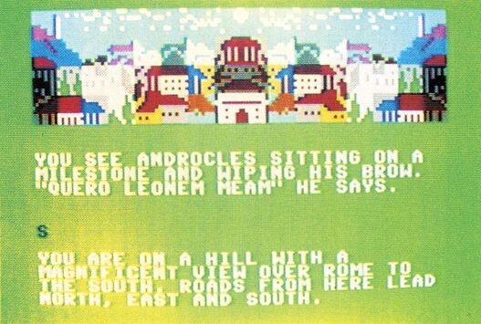 s,Mann e,t,s,Muenze geben,s,w,w↑,t, o,nw*Schlüssel b,*,*,*,*,*(s.Anm.1), Mann retten,*,n,n,Schwert kaufen,o, s,Wein kaufen,n,w,w,w,s,s,s,o,sw,o,s,t, n,w,no,w,n,n,n,o,o,o,Wein geben,w, Mann e,raus,w,n,o,n,Huhn kaufen,w,t, o,nw,n,Huhn geben,s,s,s,w,w,w,hinein,gilt,n,o,n,o,Pferd kaufen,Streitwagen kaufen,o,o,no,hinein,t,raus,sw,so, hinein,Axt kaufen,s,s,Axt schaerfen, o,t,w,n,o,t,o,Baeume faellen,o,Mann e, w,o,o,s,t,raus,w,w,w,hinein,Stuetzen b, graben,s,Hammer b,n,n,w,w,n, Muenze geben,w,n,t,s,o,o,Ei geben,t↑,s↑,h,sw,w,w,n,nw,n,n,n,n,n,o,nw, Zahn geben,Truhe oeffnen,t,Adler geben,Seerose geben,Totenschaedel geben,s,w,s,s,s,o,n,t,n,n,so,t,nw, nw,s,w,s,s,w,Robe geben,o,s,w,Sandalen kaufen,o,no,o,Kleider ausziehen, w,hinein,o,Toga t,Toga anziehen,w,w, s,s,w,n,w,w,s,hinein,Trank b↑↑,o,Ave Caesar↑,*,n,o,n,o,n,nw,n,n,o,s,Sandalen anziehen,hinein,essen/trinken (s.Anm. 2),s,s,o,t,w,Knochen geben,s, Oel t,n,n,n,o,t,s,Oel anzuenden,n,w,s, o,f,so,t (Talisman)