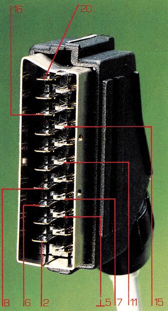 Beim SCART-Anschluß, auch als Euro-AV-Anschluß bezeichnet, ist zwischen zwei Signalen zu unterscheiden. Hier werden entweder RGB- oder Video-Signal herausgeführt. Der SCART ist auch bei Btx-fähigen Fernsehgeräten zu finden. Das ist für den C 128 interessant, denn dann kann der Fernseher mittels eines Eigenbau-Kabels als echter RGB-Monitor betrieben werden.