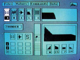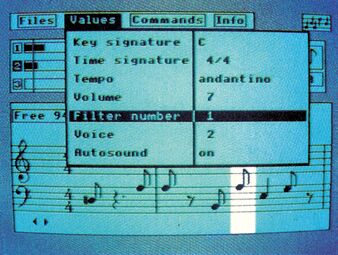 Besonders interessant ist die Makro-Funktion. Hier lassen sich beliebige Abschnitte der Komposition markieren und gesondert behandeln. Die Möglichkeiten sind sehr vielfältig. So kann man etwa einen Refrain automatisch als Ganzes transponieren, mit anderem Klang oder Lautstärke als den restlichen Song versehen, als Ganzes löschen, an andere Stellen des Liedes kopieren, zyklisch abspielen oder getrennt vom restlichen Lied entweder auf einer Art Notizzettel, dem Note Pad, zwischenspeichern oder ganz auf Diskette ablegen. All diese Optionen erreicht man mit den beiden Pull-Down-Menüs »Values« beziehungsweise »Commands«. Die beiden anderen Pull-Down-Menüs heißen »Info« und »File«. Bei Info werden Informationen über die aktuellen Daten, wie Anzahl der gespeicherten Töne oder angewählter Klang, ausgegeben. Mit »File« greift man auf die Diskette zu, zeigt Directories an und kann durch Files umbenennen.