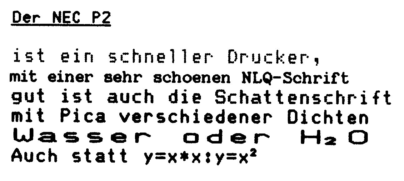 Der NEC-P2 hat einen gänzlich anderen Befehlssatz als unser Referenzdrucker, der FX-85. Aber jedes gute Textverarbeitungsprogramm läßt das Übermitteln von druckerspezifischen ESC-Befehlen zu. Damit sind dem Besitzer des P2 Tür und Tor zu den reichhaltigen Möglichkeiten des Druckers geöffnet. Die Vielfalt der Schriftbilder und Druckmodi wird durch reichliche Mischmöglichkeiten ergänzt. Je nach Druckmodus arbeitet dieser Drucker mit einer 7x9-(Schmalschrift) bis hin zu einer 21x18-(Pica NLQ) Matrix. Natürlich darf nicht vergessen werden, daß den NEC-P2 Einzelnadelansteuerung nicht ins Schwitzen bringt. Im 8- oder 16-Bit-Modus nadelt er alles aufs Papier, was er an Grafik angeboten bekommt.