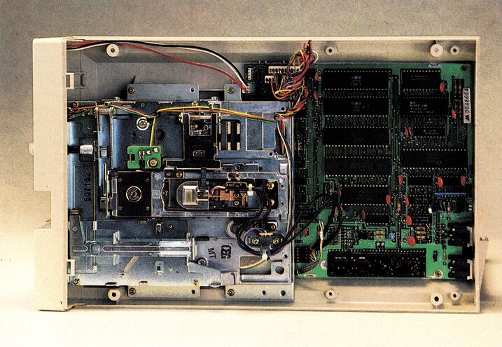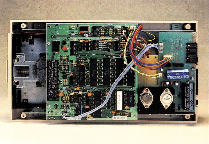 Kommen wir nun zur Mechanik, ein bei Floppy-Laufwerken sehr wichtiger Aspekt. Hier zeigen sich die ersten großen Unterschiede zwischen den beiden Modellen. Während die 1570 eine leicht verbesserte Version der 1541-Mechanik verwendet, ist die der 1571 völlig neu entwickelt worden. Die Verbesserungen in der 1570 beschränken sich auf zwei Lichtschranken. Die eine fragt das Indexloch ab und wird bei manchen CP/M-Formaten verwendet. Die zweite Lichtschranke stoppt den Schreib/Lese-Kopf eine Halbspur vor dem Anschlag am Steppermotor und verhindert somit das rhythmische Klappern beim Formatieren und bei Lesefehlern. Diese beiden Lichtschranken sind ebenfalls in der 1571 vorhanden. Die Mechanik der 1571 macht allerdings einen professionelleren und stabileren Eindruck als die der 1570. Wichtigstes Unterscheidungsmerkmal: Die 1571 hat einen doppelten Schreib/Lese-Kopf, mit dem auf beide Seiten der eingelegten Diskette zugegriffen werden kann. Sehr vorteilhaft ist uns die völlige thermische Entkopplungvon Mechanik, Netzteil und Elektronik aufgefallen. So dürften bei der 1541 die bekannten Überhitzungsprobleme, die zu verstellten Köpfen und defekten ICs führten, beseitigt sein. Einzige Minuspunkte der 1571 sind der zerbrechlich wirkende Knebelverschluß und der von schräg oben nur sehr schwer erkennbare Diskettenschacht.