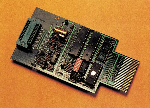Das Steuerprogramm befindet sich in einem EPROM auf der Platine des EPROM-Programmiergeräts, das am Expansions-Port angeschlossen wird (vergoldete Kontakte). Als EPROM hierfür kann ein 2764 oder 27128 verwendet werden. Über DIP-Schalter wird der EPROM-Typ eingestellt. Beim »27128« kann man wählen, ob man die gesamten 16 KByte laden will, oder nur den unteren oder oberen 8-KByte-Teil. Ebenso bei dem zusätzlichen freien Stecksockel auf der Platine, in dem man beispielsweise gebrannte EPROMs auf Funktionsfähigkeit testen kann.