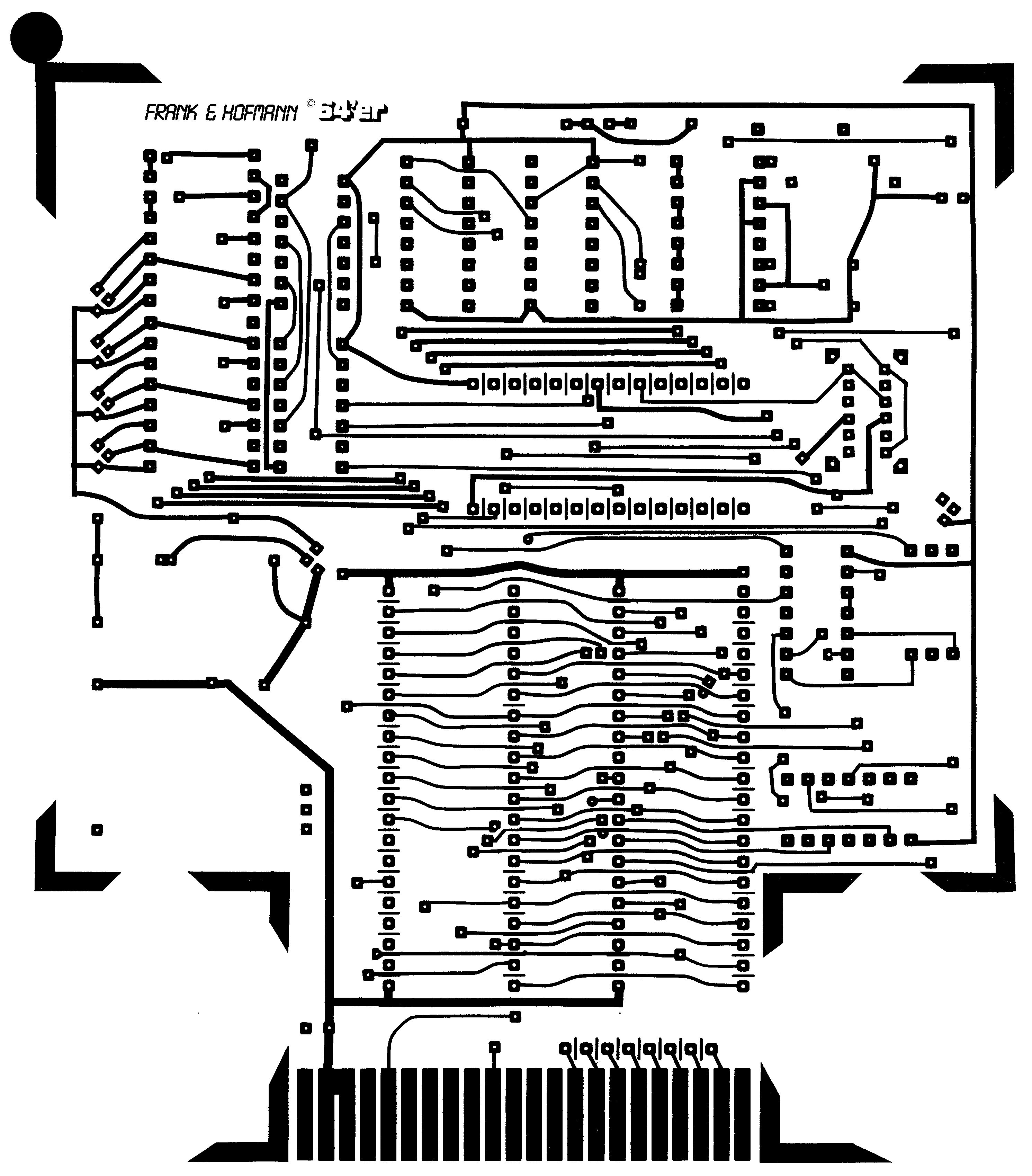 Nachdem wir in der letzten Ausgabe die Funktionsweise des 64’er EPROM-Programmiergerätes rein theoretisch behandelt haben, werden wir in dieser Ausgabe eine ausführliche Bau- und Bedienungsanleitung für das Selbstbau-Programmiergerät bringen. Die zugehörige Software erscheint in der nächsten Ausgabe. Beginnen wir beim wichtigsten Teil des EPROM-Programmiergeräts, bei der Platine. Es handelt sich hierbei wegen der vielen Leiterbahnen (Adreß- und Datenbusse etc.) um eine doppelkaschierte (zweiseitige) Platine. Der Nachbau dieser Platine erfordert schon eine gewisse Portion an Erfahrung, da die beiden Platinenlayouts (Bild 1: Lötseite; Bild 2: Bestückungsseite) genau deckungsgleich sein müssen. Eine Ungenauigkeit von nur einem Millimeter kann die Platine schon unbrauchbar machen. Ein weiteres Problem werden die Durchkontaktierungen (Verbindungen zwischen beiden Platinenseiten) bereiten. Solche Durchkontaktierungen können im Regelfall nur von professionellen Platinenherstellern fehlerfrei angefertigt werden. Wer also zu wenig Erfahrung bei der Platinenherstellung hat, kann ab der nächsten Ausgabe die unbestückte Platine und den Spannungswandler beim 64'er Hardware-Service beziehen.