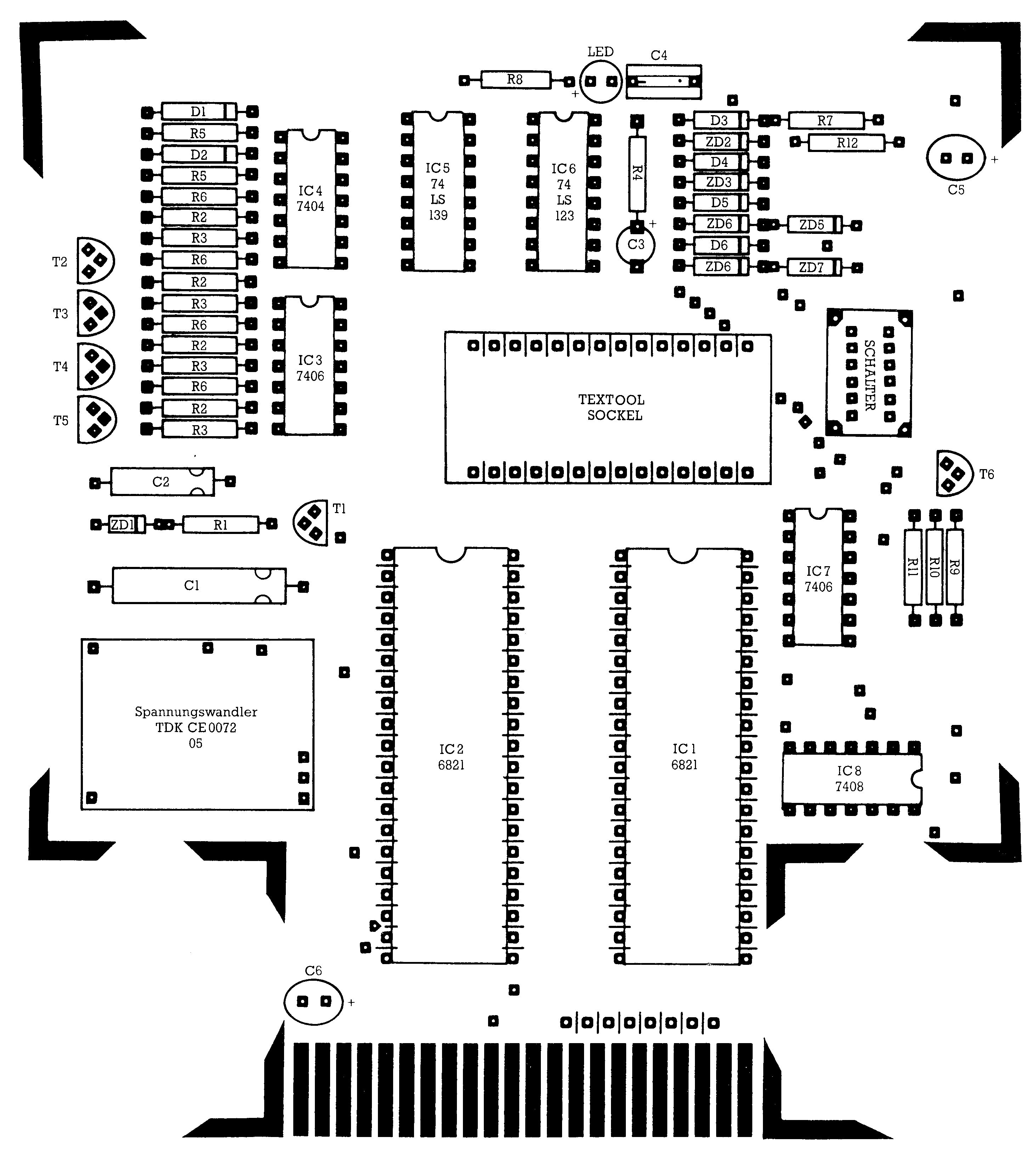Auch bei den Dioden ist auf die Polung zu achten. Die Kathode ist bei jeder Diode durch einen Ring am Diodengehäuse gekennzeichnet (Bild 4). Bei Leuchtdioden ist der Anschluß für die Anode kürzer als der Anschluß für die Kathode. Die Transistoranschlüsse können der Abbildung 4 entnommen werden. Das Platinenlayout ist jedoch so angefertigt, daß ein falsches Einlöten fast unmöglich ist. Sind alle anderen Bauteile (inklusive Schalter) verlötet, so werden die ICs eingelötet. Es empfiehlt sich vor allem bei den beiden I/O-Bausteinen (6821) Fassungen zu verwenden, um sie bei eventuellen Ausfällen leichter ersetzen zu können. Die Bauteileliste finden Sie in Bild 5, den Bestückungsplan in Bild 6. Auch beim Löten selbst sind einige wichtige Punkte zu beachten: Um möglichst saubere Lötstellen zu erhalten, sollte man zuerst das Bauteil erhitzen und anschließend Zinn zugeben. Erhitzt man zuerst das Lötzinn und benetzt anschließend damit das Bauteil, so resultiert daraus meist eine »kalte Lötstelle«. Beim Einlöten von Halbleitern (ohne Fassung) sollte man, um eine Überhitzung zu vermeiden, nach jedem zweiten bis dritten Pin eine Pause machen und das Bauteil abkühlen lassen.
