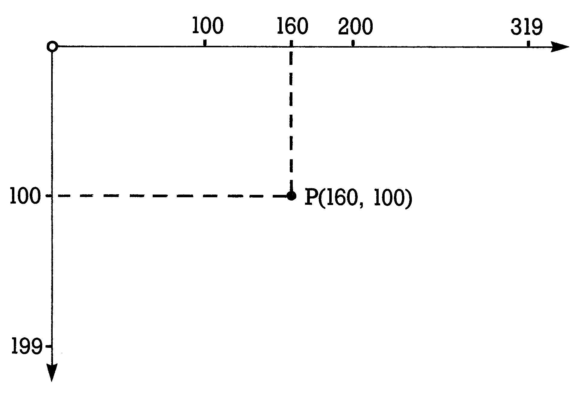 Nun erkennen Sie vielleicht schon, daß Commodore uns ein reichlich ungebräuchliches Koordinatensystem beschert hat: Es ist nämlich linkshändig aufgebaut. Außerdem ist die Skala sowohl auf der X-, als auch auf der Y-Achse sehr unpraktisch, denn Punkte wie zum Beispiel Pl(-1,4) oder P2(3,-5) und P3(-12,-3) können nicht gezeichnet werden, und ein Versuch, das trotzdem zu tun, endet mit einer Fehlermeldung.