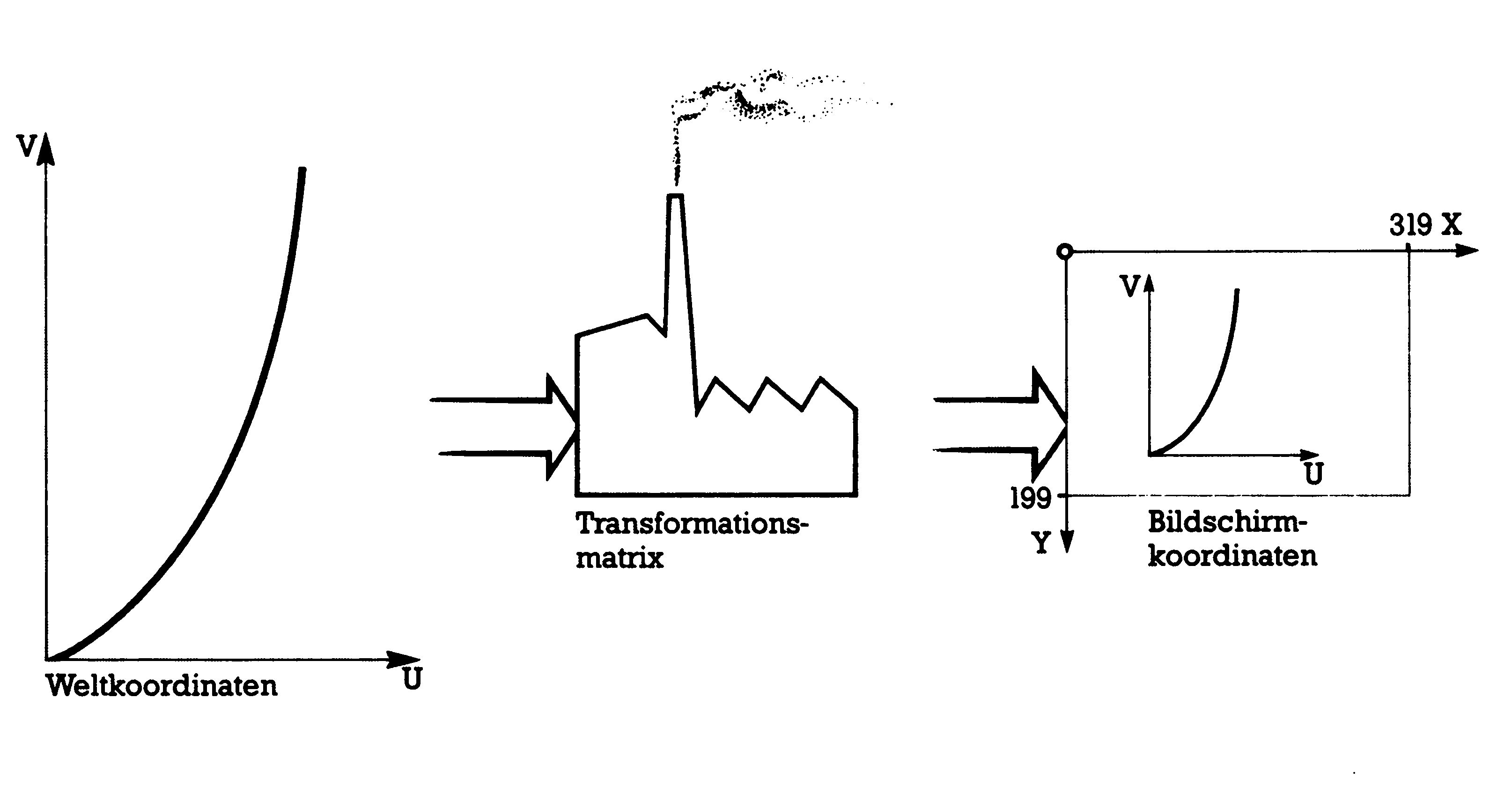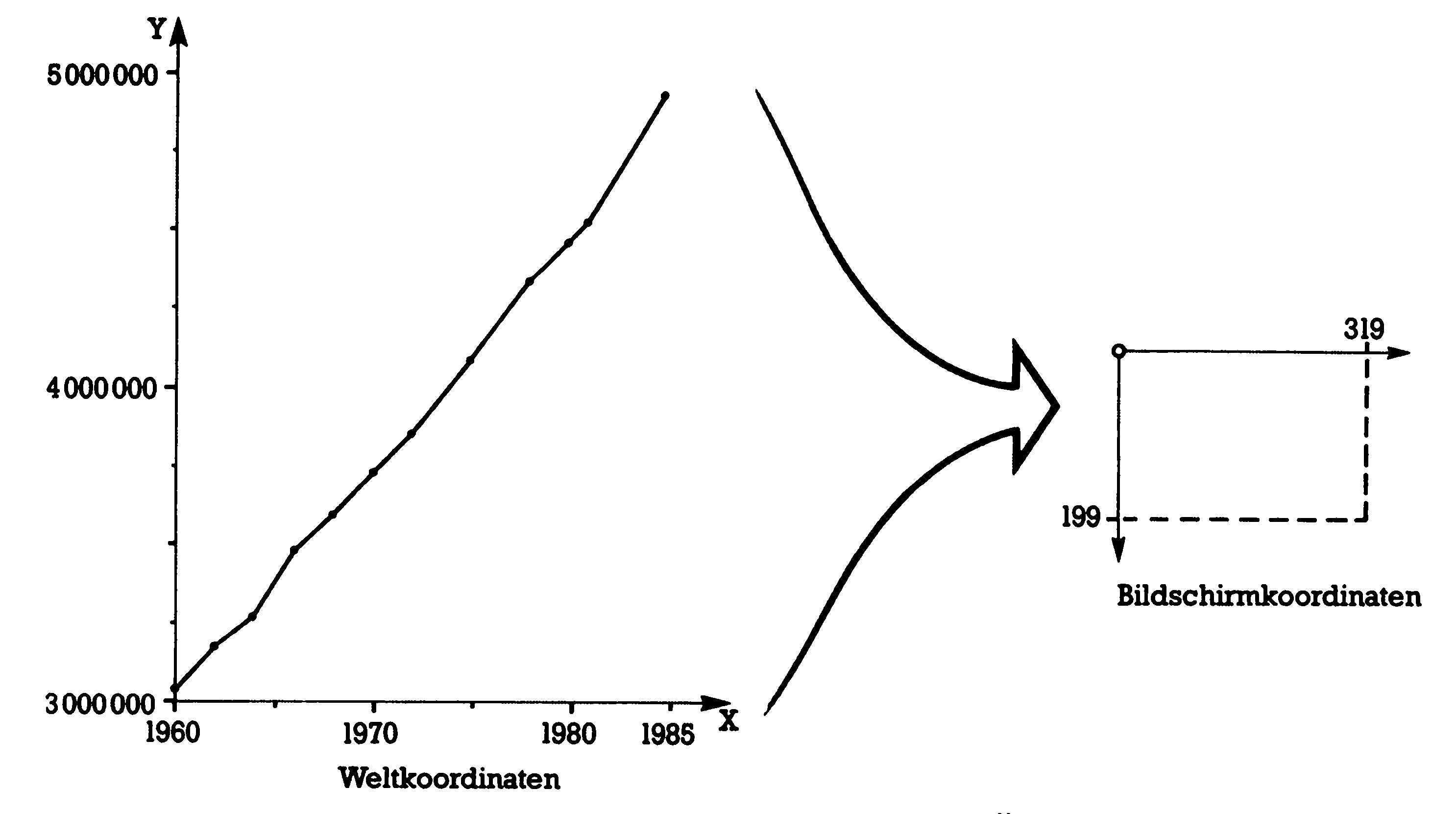 Wir müssen also irgendwie die Objekte der realen Welt, die wir im Weltkoordinatensystem festgelegt haben, auf unserem Bildschirm zeigen (siehe Bild 8). Weil es aber nicht möglich ist, auf dem Commodore-Bildschirm den Punkt P(1981,4508000) darzustellen (das ist beispielsweise die Aufgabe des oben erwähnten Ökologen), müssen wir irgendeine Form der Umrechnung durchführen. Solche Umrechnungen nennt man Transformationen (vom spätlateinischen »transformatio«, was Umbildung, Verwandlung von etwas bedeutet, ohne dessen Wert zu ändern).