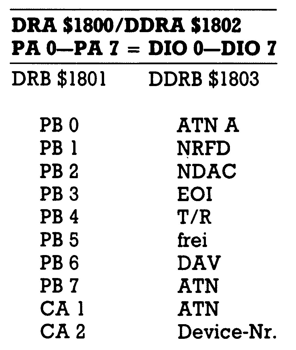 Um den parallelen Bus zu realisieren wird einer der beiden Portbausteine VIA 6522 benötigt. Dieser VIA-Baustein CVersatile Interface Adapter) ist teilweise nicht beschältet. Üm der IEC-Norm entsprechen zu können, sind acht Datenleitungen, sowie fünf Handshake-Leitungen zum Verbindungsaufbau erforderlich. Über die Handshake-Leitung teilt der Computer dem Laufwerk mit, daß er Daten senden, beziehungsweise empfangen möchte (ATN), daß die Daten gültig sind (DAV), daß keine Daten empfangen werden können (NRFD), daß die Daten noch nicht verarbeitet wurden (NDAC), oder daß die Übertragung beendet wurde (EOI). Wenn der Computer eine solche Übertragungssequenz beginnt, wird zuerst festgestellt, ob das Peripheriegerät überhaupt vorhanden beziehungsweise eingeschaltet ist (DEVICE NOT PRESENT). Hierfür sind die Leitungen »NRFD« und »NDAC« zuständig. Wird »ATN« gesetzt, so müssen beide Leitungen sofort nach Masse gezogen werden. Diese Funktion übernimmt das TTL-Gatter (EX-OR 74LS136) in der Schaltung. Die IEC-Norm schreibt weiterhin »Open-Collector«-Ausgänge vor, um mehrere Geräte anschließen zu können, das heißt die Leitungen sind im aktiven Zustand auf Masse-Potential (Low). Die 6522-VIA (Portbelegung siehe Bild 1) hat aber TTL-Pegel. Die notwendige Anpassung übernehmen die beiden IEC-Treiber 75160/161.