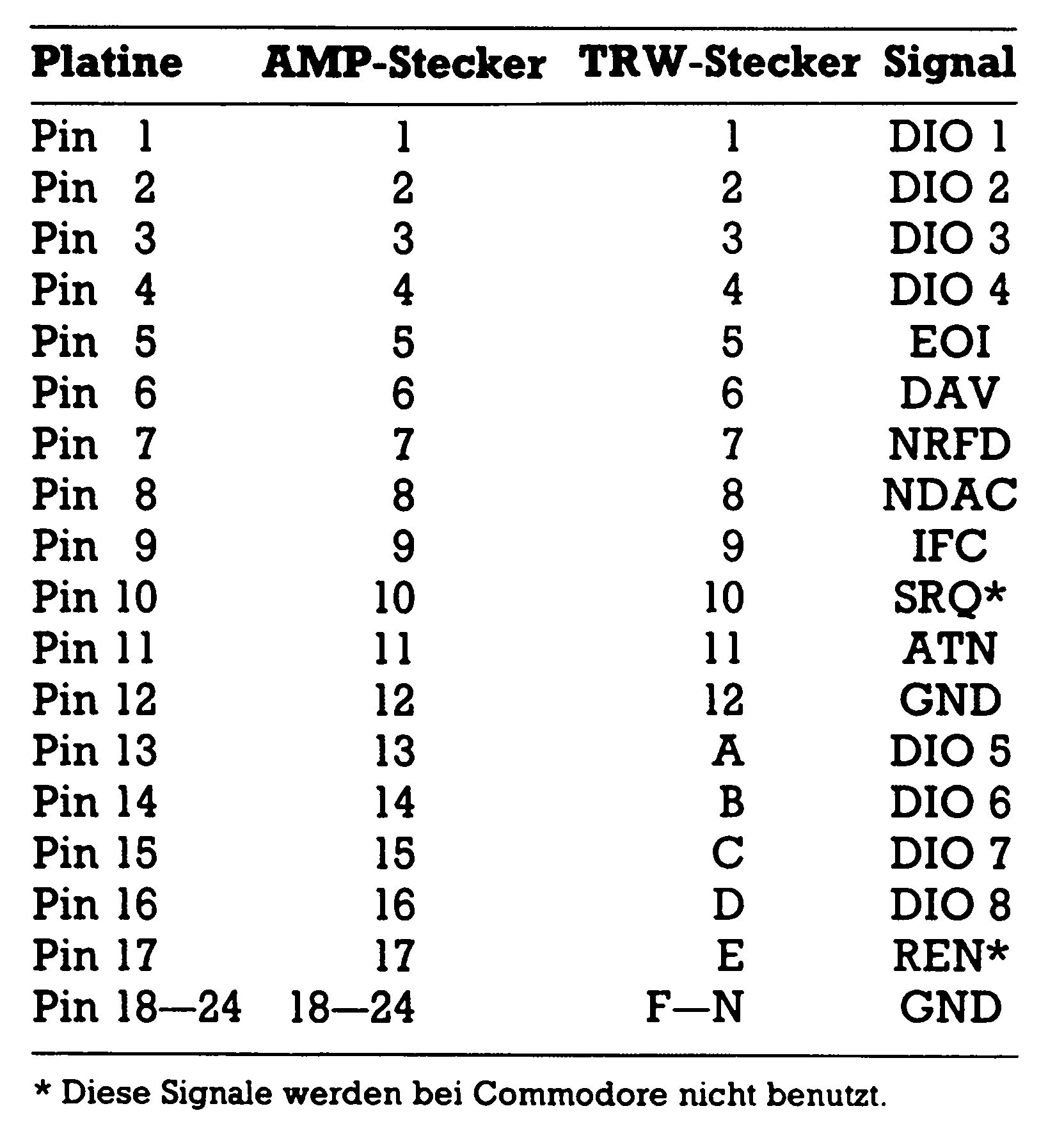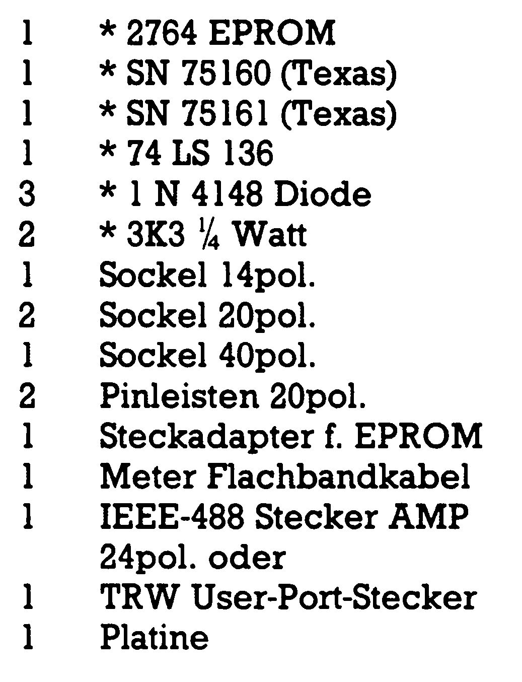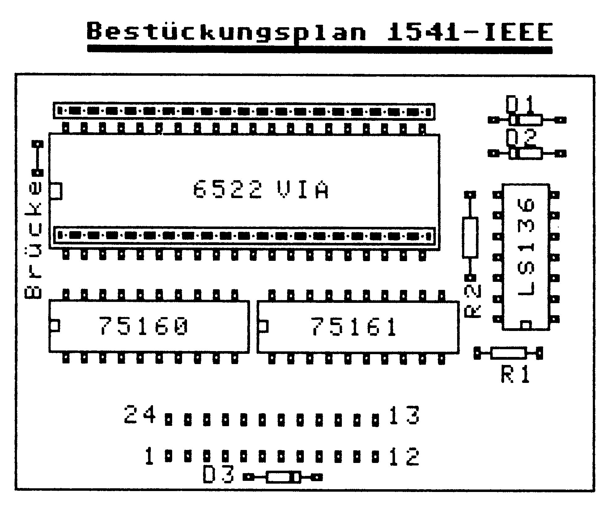 Den Schaltplan, den Bestückungsplan sowie das Platinenlayout im Maßstab 1:1 finden Sie in Bild 2 bis 4. Bitte beachten Sie, daß die Bestückungsseite die Platine von oben, und die Lötseite die Platine von unten zeigt. Aus Bild 5 entnehmen Sie bitte die Bauteileliste. Die Platine wurde einseitig ausgeführt. Es empfiehlt sich, alle Bausteine zu Sockeln, um sie bei eventuellen Beschädigungen leicht auswechseln zu können, in jedem Fall muß aber der 6422 gesockelt sein. Die Position der Bauteile entnehmen Sie dem Bestückungsplan. Zuerst werden die Widerstände R1 + R2 und die Drahtbrücke eingelötet. Bei den Dioden Dl, D2 und D3 muß auf die Einbaurichtung geachtet werden. Der Pfeil zeigt auf die Anode, was zumeist durch einen Ring gekennzeichnet wird. Anschließend werden die Sockel verlötet. Um die Schaltung in den VIA-Sockel UC3 einsetzen zu können, müssen zwei 20polige Pinleisten von der Lötseite auf die Platine gelötet werden. Dieser Vorgang erfordert besondere Sorgfalt damit keine unerwünschten Lötbrücken entstehen. Zuletzt ist nur noch das IEEE-Anschlußkabel einzulöten und die Bausteine können eingesetzt werden. Um den Kabelanschluß zu vereinfachen kann ein Einpreßstecker mit Flachbandkabel verwendet werden. Die Anschlußbohrungen sind bereits nach IEEE-Norm angeordnet (siehe Bild 6).
