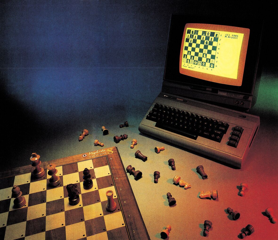 Verblüffend ist, daß C 64 wie Mephisto vom technischen Standpunkt sehr ähnlich sind. Beide verwenden fast denselben Prozessor und sind somit ähnlich programmiert — allerdings ist der Mephisto von vorne herein etwas schneller und muß sich dann auch nicht mit Bildschirmgrafik und Soundeffekten herumschlagen wie der C 64. Somit hat er intern viel mehr Zeit für seine Berechnungen.