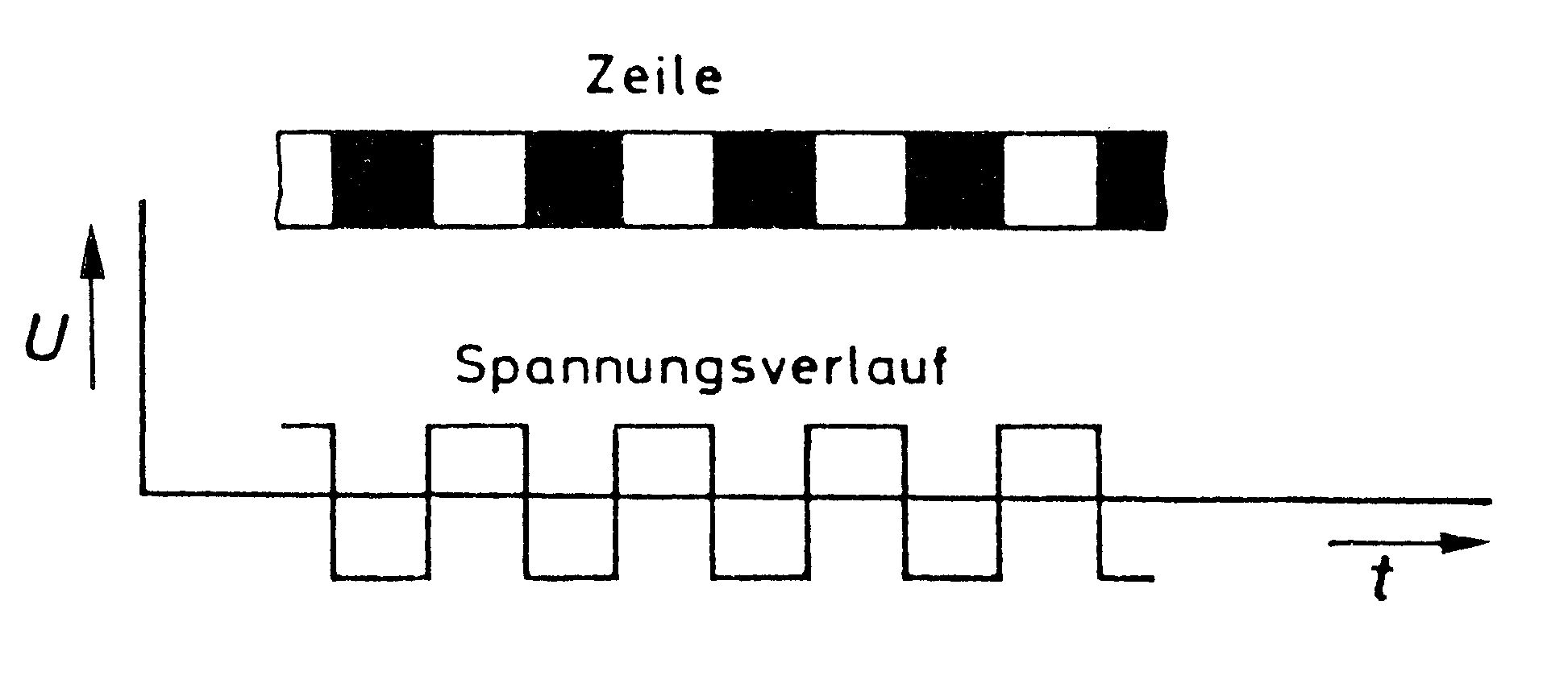 Für 80 Zeichen mit je 8 x 8 Pixel werden 8 x 80 = 640 Pixel benötigt. Nimmt man nun an, daß sich aufgrund des Bildschirmrahmens nur etwa zwei Drittel einer Zeile nutzen lassen, folgt, daß sich die Anzahl der benötigten Pixel pro Zeile um den Faktor 3/2 erhöht. Man braucht also letztendlich 640 x 3/2 = 940 Pixel. Wenn diese Pixel abwechselnd schwarz und weiß sein sollen, muß die Bildröhre mit einer rechteckförmigen Wechselspannung angesteuert werden (Bild 3). Die Frequenz dieser Rechteckspannung läßt sich aus der Anzahl der Schwarzweiß-Sprünge je Zeile und der Zeilenzahl je Sekunde berechnen.