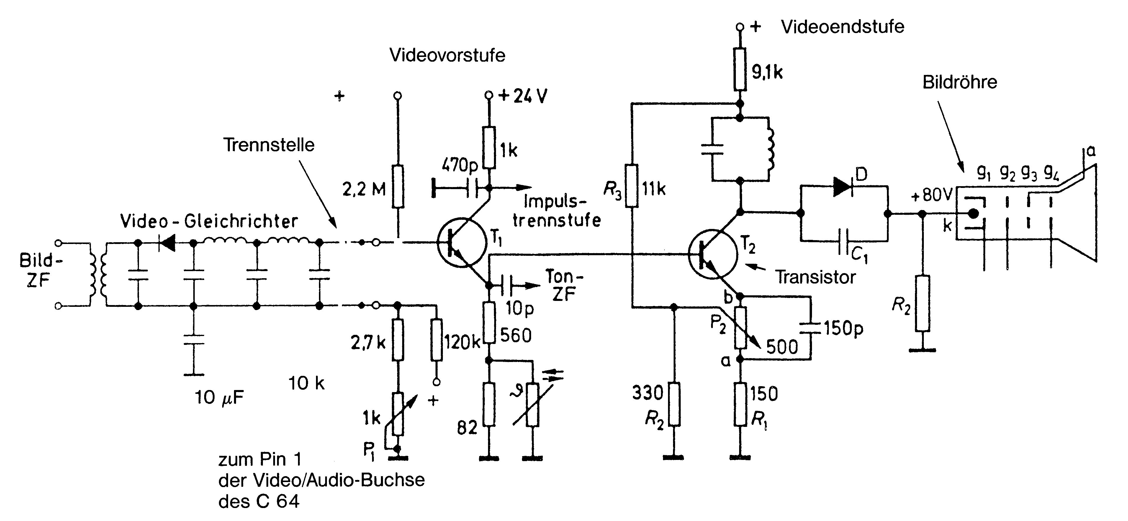 In vielen Haushalten existiert neben dem normalen Fernsehgerät häufig auch noch ein kleines tragbares oder ein älteres Schwarzweiß-Fernsehgerät. In den meisten Fällen reicht zum vernünftigen Arbeiten mit dem Computer ein solches Schwarzweiß-Fernsehgerät vollständig aus. Das Problem ist nur der Modulator im C 64, der das niederfrequente Signal des Videoprozessors mit einer hochfrequenten Trägerschwingung mischt beziehungsweise moduliert. Dieses modulierte, hochfrequente Signal liegt am Antenneneingang des Fernsehgerätes an. Im Tuner und im nachfolgenden ZF-Verstärker (Zwischenfrequenz-Verstärker) wird aus dem hochfrequenten Eingangssignal wieder ein Signal erzeugt, das mit dem vom Prozessor erzeugten Signal identisch ist. Durch diese »Signalumsetzerei« werden aber die Flanken des Videosignals abgeflacht. Das Ergebnis ist ein unscharfes Bild. Außerdem wird es durch ein perlschnurartiges Zeilenraster (Moirebildung) beeinträchtigt. Der Modulator des C 64 hat noch eine weitere unangenehme Eigenschaft. Die Trägerfrequenz ist abhängig von der Betriebstemperatur des Computers. Das heißt, daß sich mit zunehmender Temperatur die Frequenz der Trägerschwingung ändert. Das wiederum macht ein permanentes Nachregulieren des Fernsehgerätes erforderlich.
