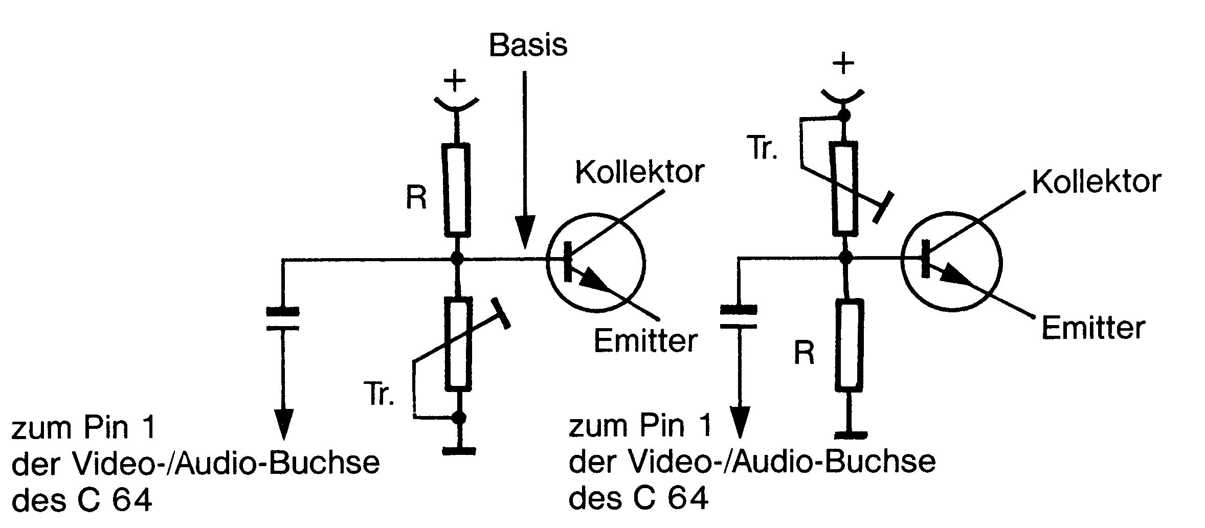 Da das Ausgangssignal des C 64 leicht positiv vorgespannt ist, muß zwischen dem Videoausgang des C 64 und der Basis des Videovorverstärkers ein Kondensator eingebaut werden. Hat man keinen bipolaren Kondensator zur Verfügung, kann ersatzweise ein Elektrolytkondensator genommen werden. Dabei ist jedoch auf die Polarität zu achten, die Sie am besten mit einem Vielfachmeßinstrument ausmessen. Dazu ist der Pin 2 der Audio-/Video-Buchse des C 64 mit der Masse des Fernsehgerätes zu verbinden. Schalten Sie nun beide Geräte ein und messen im Gleichspannungsmodus die Spannung zwischen der Basis des Videovorstufentransistors und dem Videoausgang des C 64 am Pin 1 der Audio-/Video-Buchse. Zeigt das Meßinstrument einen Ausschlag in positiver Richtung, ist der positive Pol derjenige, der mit der roten Klemme des Meßinstrumentes verbunden ist. Dieser positive Pol ist mit dem » + «-Pol des Elektrolytkondensators zu verbinden, nach Möglichkeit aber nicht direkt, sondern über eine geeignete Buchse. Der »-«-Pol des Elektrolytkondensators kommt an die Basis des Videovorstufentransistors. Ist das geschehen, muß mit Hilfe des Trimmpotentiometers noch der Arbeitspunkt des Videovorstufentransistors eingestellt werden. Dazu drehen Sie so lange an dem Potentiometer, bis das Bild einwandfrei steht und nicht mehr verzerrt ist. Möchten Sie auch die Soundmöglichkeiten des C 64 nutzen, läßt sich das ebenfalls machen. Dazu können Sie den Audioausgang des C 64 direkt an den Schleifer des Lautstärkenreglers anlöten.