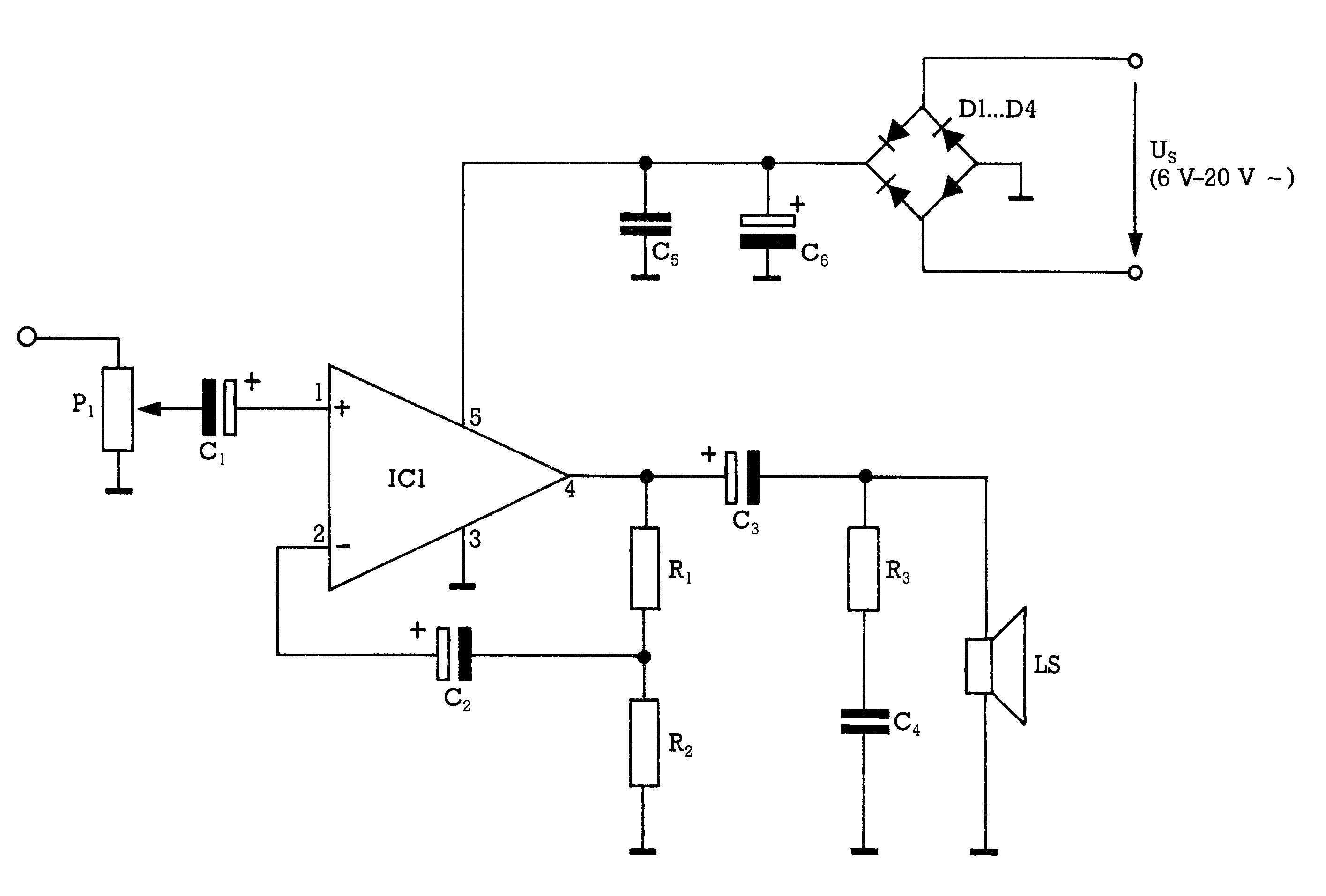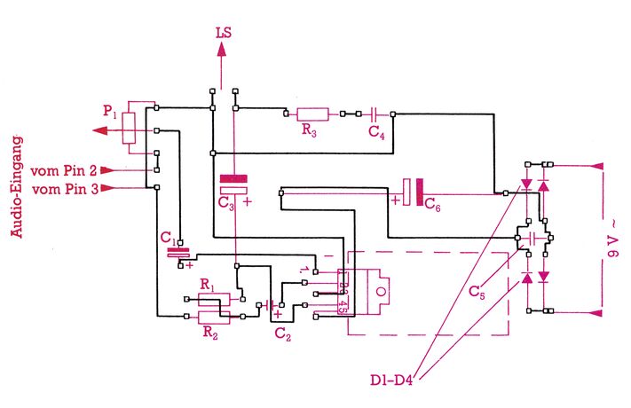 Das RC-Glied am Lautsprecherausgang dient zur Unterdrückung eventueller Schwingneigungen des Verstärkers.