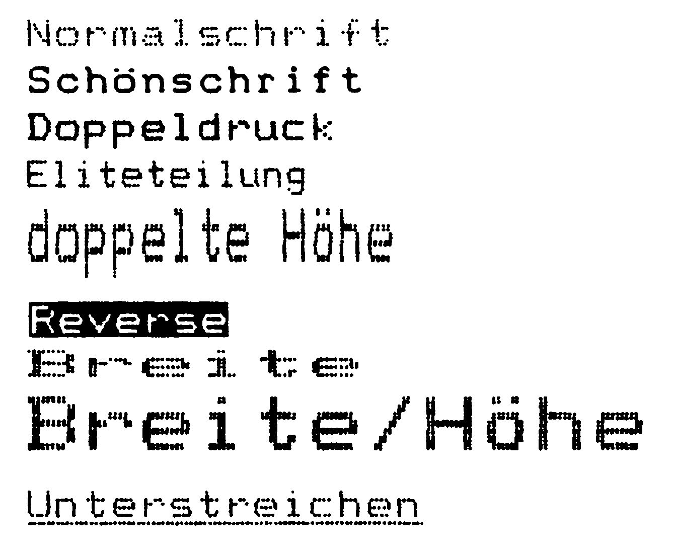 | Schriftarten: | Pica, Elite, Schmal, Breit, Doppel, Fett, Italic | ||