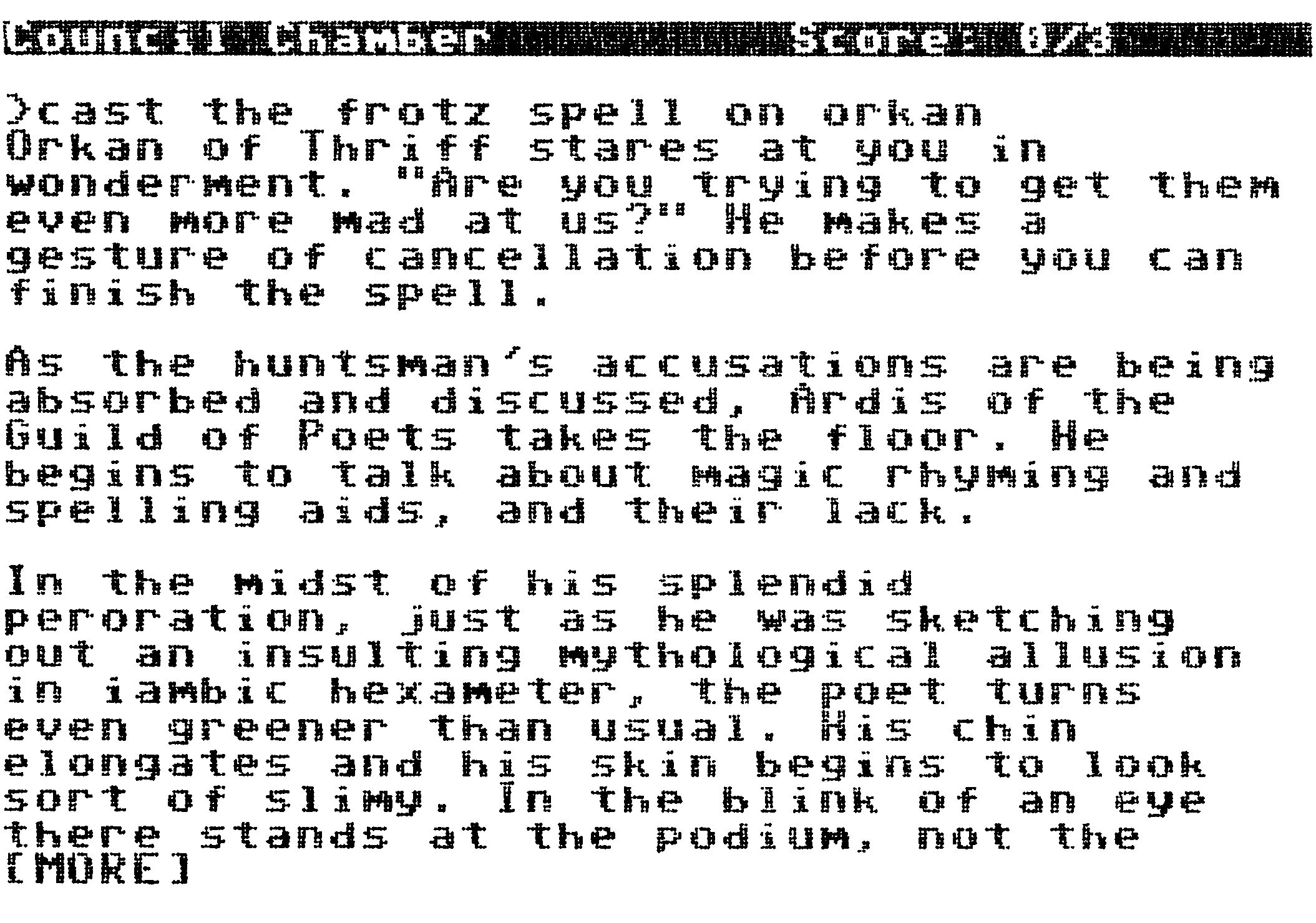 Für Freunde des Zauberns und der schweren Rätsel ist »Spellbreaker« gedacht, der dritte Teil der »Enchanter«-Trilogie. Sie sind zum Vorsitzenden der Zauberer-Gilde ernannt worden, als etwas Merkwürdiges passiert. Zaubersprüche funktionieren nicht mehr, wie sie sollen, werden unwirksam oder wenden sich gegen die Zauberer selbst. Eine Krisensitzung der Zauberer-Gilde wird einberufen, und mitten in einer heftigen Diskussion über die Ursachen dieser Veränderungen verwandeln sich alle Anwesenden in Kröten, Schlangen, Eidechsen und ähnliches Getier. Nur Sie kommen davon und müssen jetzt natürlich versuchen, diesen bösen Zauber zu brechen. Daß es dabei nicht immer bierernst und teilweise recht unlogisch zugeht, sagt schon der Leitspruch eines der verwandelten Zauberer — »Magic doesn't have to be great to be useful, nor does magic have to be useful to be great«. Der schweren Rätsel gibt es viele, darunter befindet sich auch ein seltsames Kartenspiel, das sich »Double Fanucci« nennt. »Spellbreaker« ist nur etwas für den Infocom-Kenner, der auch vor verzwickter Gehirnakrobatik nicht zurückschreckt, denn es ist nach Herstellerangabe das schwerste Infocom-Adventure.