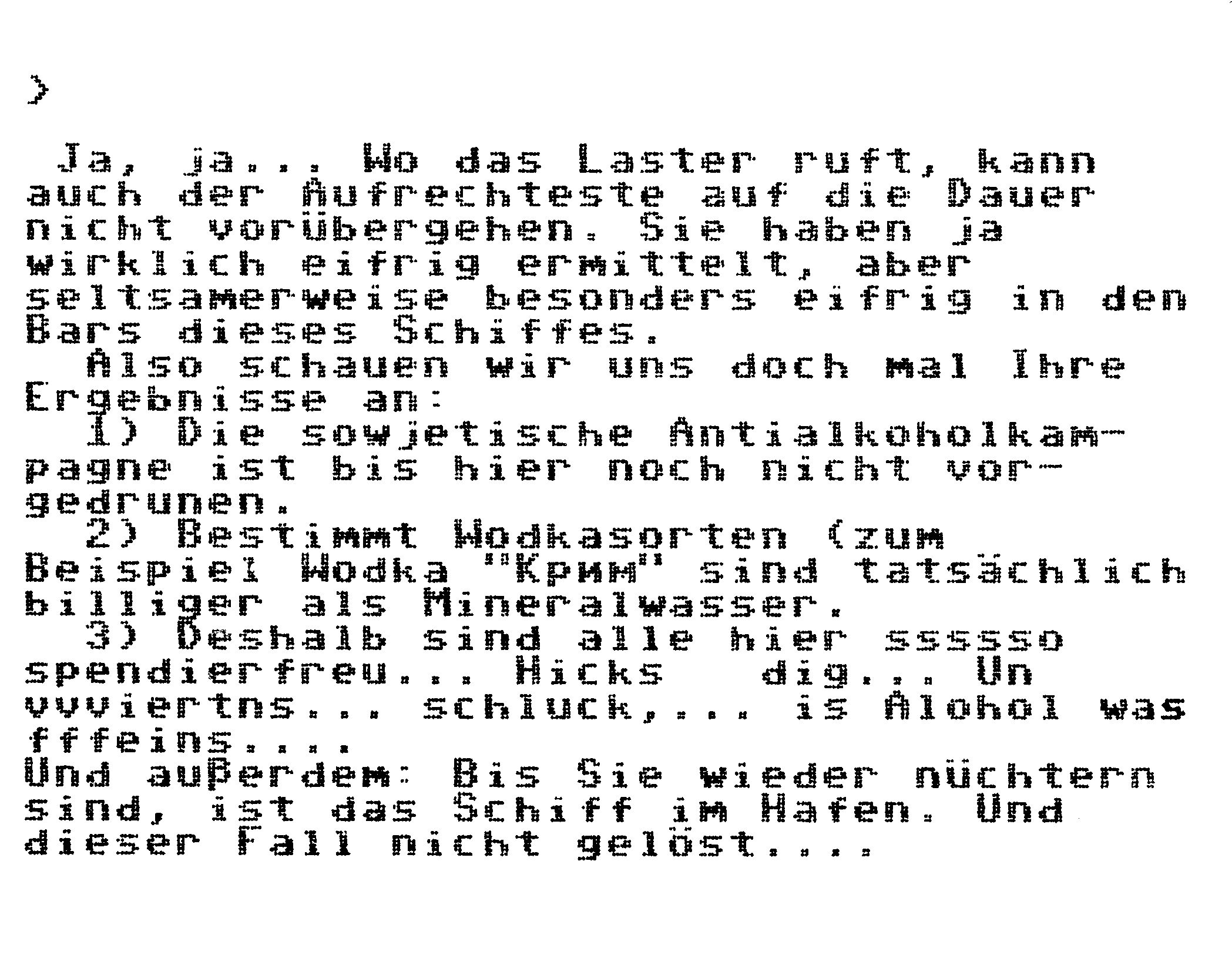 Wer von englischsprachigen Adventures Abstand halten will, der kann mit »Mord an Bord« von Axis-Komputerkunst eines der wenigen intelligent gemachten deutschsprachigen Adventures erleben. Die Handlung ist bester Krimi-Adventure-Standard. An Bord eines russischen Kreuzfahrtdampfers geschehen einige Verbrechen, vom Juwelenraub bis zum Mord, die der mitreisende Beamte von Scotland Yard (gemeint sind Sie) aufklären soll. Die Textausgabe erinnert mit bildschirmseitenlangen Kommentaren und Raumbeschreibungen an Infocom-Adventures, ebenso die Möglichkeit, mit fast allen mitfahrenden Passagieren zu reden. Außerdem ist eine Echtzeitkomponente in das Spiel eingebaut: Alle Vorkommnisse an Bord richten sich nach einer internen Uhr, die ungefähr viermal schneller als eine normale läuft. Bleibt man beispielsweise bis nach 23 Uhr in der Bordbar, kann der Fall wegen zu hohem Blutalkoholspiegel nicht mehr abgeschlossen werden. Zahlreiche Details, wie ein kyrillischer Zeichensatz für Aussagen von russischen Mitfahrern und die exklusive Passagierliste Jack & Amiga Gramiel, Ada Augusta Lovelace, Bohris Becker, etc.), runden das Gesamtbild ab. »Mord an Bord« wäre also das erste voll gelungene deutsche Adventure — wenn der Parser nicht wäre. Das Programm versteht nur Zwei-Wort-Eingaben (»Bier trinken, Bohris Becker ausfragen«) eines sehr kleinen Wortschatzes (maximal 200 Wörter) und achtet dabei penibelst auf Recht- und Groß-/Klein-Schreibung. Schade um diesen einzigen Schwachpunkt, der das Gesamtbild doch trübt.