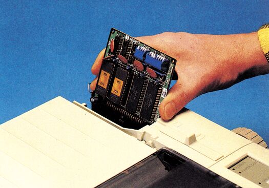 Was wäre ein Drucker ohne seine Steuerbefehle? Beim DX 2100 hat man wohl eine der bemerkenswertesten Auswahlpaletten an ESC-Befehlen, denn sowohl die FX-85 als auch die JX-80 Farbsteuerbefehle sind vorhanden (Tabelle). Wer aber lieber die Schriften mit Schaltern oder Tasten einstellen möchte, braucht beim DX 2100 nicht lange zu suchen. Die vier Funktionstasten dienen, je nachdem, in welcher Reihenfolge, beziehungsweise Kombination sie gedrückt werden, dazu, 14 verschiedene Schriften beziehungsweise Funktionen aufzurufen oder zu löschen. Alle diese Funktionen sind auf die gängigsten Programme abgestimmt. Es bereitet deshalb keine Schwierigkeiten, mit so beliebten Hilfen wie Print Shop, Vizawrite 64, Hi-Eddi oder Vizastar 64 zu arbeiten. Hier ist es allerdings wichtig, mit welchem Interface der DX 2100 an den C 64 oder C 128 angeschlossen wird. Verwendet werden können alle Soft- und Hardwareinterfaces (sofern sie nicht in den Drucker eingebaut werden müssen), die für die Epson-Drucker angeboten werden. Auch das Betriebssystem aus Ausgabe 11 im Artikel »Herzoperation« funktioniert einwandfrei. Dank einem in dieser Form noch nie dagewesenen Steckkartenkonzept kann praktisch jede beliebige Schnittstelle entwickelt werden und in Form einer Karte eingeschoben werden. Auch die Aufrüstung des internen Speichers von 2 KByte ist um 8 KByte oder 16 KByte mit zwei Handgriffen durch einfaches Einstecken der Karte möglich (Bild 5). Da die sonst so gerne versteckten DIL-Schalter beim DX 2100 auf der Speicherkarte angebracht sind, kann man sie zwar nicht unmittelbar, aber immerhin ohne große Umstände und ohne Werkzeug erreichen. Der Zugriff auf die DIL-Schalter ist aber wegen dem weiter oben beschriebenen Bedienereinstellmodus nur in sehr seltenen Fällen notwendig. Einen Nachteil des DX 2100 konnten wir während des Tests allerdings doch noch entdecken: Die Anzeige-LEDs für ON Line, NLQ und Power On sind etwas zu schwach und zu klein.