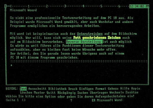 Der PC 10 (Bild 1) ist ein MS-DOS-Computer. Das heißt, sein Betriebssystem nennt sich Microsoft-Disk Operating System nach der Firma, die es programmiert hat. MS-DOS ist neben CP/M das verbreitetste Betriebssystem für Personal Computer. MS-DOS basiert auf dem Mikroprozessor Intel 8086 oder 8088, wobei der erste ein echter und der zweite ein nicht ganz echter 16-Bit-Mikroprozessor ist. Der 8088 besitzt nämlich im Gegensatz zum 8086 nur einen 8-Bit-Datenbus. Für MS-DOS gibt es so ziemlich jedes Programm, das das Herz erfreut. Darunter befinden sich so hochkarätige Namen wie Microsoft Word (Preis: 1708 Mark, Bild 11) oder Micropro Wordstar (Preis: 1470 Mark), aber auch ein Vizawrite PC gibt es. Der Vorteil dieses Systems liegt in der hohen Verarbeitungsgeschwindigkeit, der exzellenten Funktionsausstattung der Programme und der Bildschirmdarstellung von 80 Zeichen. Mit einem PC 10 arbeitet man in der Regel nur an einem monochromen Monitor, der zum Lieferumfang gehört. Wer möchte, kann den PC 10 aber mit einer Vielzahl von Steckkarten, unter anderem auch mit einer Farbkarte, aufrüsten. Der Anschluß eines Druckers ist beim PC 10 beispiellos einfach, denn ein einfaches Standardkabel wird zwischen Computer und Drucker gesteckt. Wir haben als Beispiel unseren Referenzdrucker der Preisklasse über 1400 Mark, den Fujitsu DX 2100 angeschlossen, denn er ist eine ideale Ergänzung des PC 10. Alle anderen Anpassungen lassen sich mit dem betreffenden Programmen vornehmen. Wesentlich besser als bei billigeren Systemen ist natürlich auch die Tastatur. Sie entspricht allen Anforderungen an ein schnelles und ermüdungsfreies Arbeiten und ist in einem separaten, flachen Gehäuse untergebracht. Es würde den Rahmen dieses Artikels sprengen, um alle Funktionen des PC 10-Systems aufzuzählen, aber allein die Tatsache, daß das 64’er-Magazin zu großen Teilen auf dem PC 10 entsteht, zeigt die Leistungsfähigkeit. Der Preis für dieses System bewegt sich einschließlich Microsoft Word bei ungefähr 9320 Mark, Listenpreise vorausgesetzt. Wer sich aber etwas umschaut, kann leicht ein paar Tausender sparen.