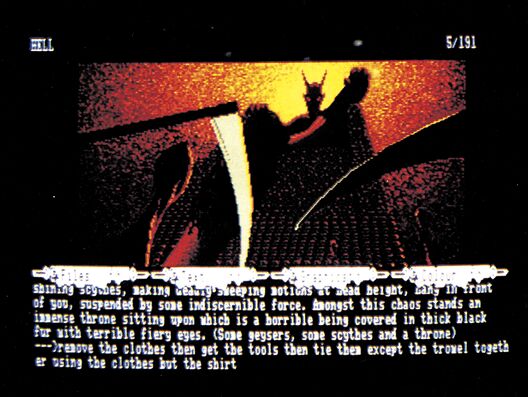 Für Europa wenig Neues gab es bei Firebird. Das englische Softwarehaus hat nun auch eine amerikanische Filiale. Dementsprechend wurden auf der Messe in Europa schon bekannte Firebird-Spiele wie »Elite« und »Revs« vorgestellt. Eine Premiere hatte hingegen eine Schwesterfirma von Firebird namens Rainbird, die das Grafik-Adventure »Pawn« vorstellte. Das Besondere an »Pawn« ist der Parser, in dem mehrere Jahre Entwicklungszeit stecken. Die Eingabe auf dem Bildschirmfoto in Bild 11 lautet: »remove the clothes then get the tools, tie them except the trowel together using the clothes except the shirt«. Und das ist nur eine der einfacheren Anweisungen, die der Parser von »Pawn« versteht und innerhalb von Sekundenbruchteilen analysiert. Der Parser bietet einen Grundwortschatz von weit über 1000 Wörtern, der aber beliebig aufgestockt werden kann. Außerdem soll eine Übersetzung in andere Sprachen problemlos sein. Infocom und Synapse, die bisherigen Könige der Parser-Technologie, müssen wohl auf ihrem Thron etwas zusammenrücken.