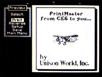 Wer noch gar keinen »Print Shop« hat, dem wird mit »Print Master« von Unison World eine echte Alternative geboten. Die Ähnlichkeiten zum »Print Shop« sind verblüffend, der »Print Master« kann aber wesentlich mehr. So lassen sich beispielsweise auch Kalender drucken, man hat mehr Zeichensätze und größere Grafiken zur Verfügung und kann sich seine Kreationen vor dem Ausdruck am Bildschirm ansehen (Bild 2). »Print Master« gibt es für viele verschiedene Computer, vom IBM-PC und Atari ST bis hin zum C 64. Für den deutschen Vertrieb werden höchstwahrscheinlich sogar Umlaute integriert, hier wollte man sich aber noch nicht völlig festlegen. Auch ein genauer Preis steht noch nicht fest.