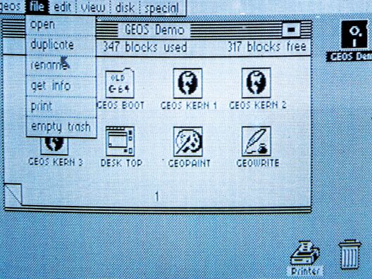 Das letzte große Anwendungsprodukt für den C 64 heißt »Geos« und ist ein komplett neues Betriebssystem. »Geos« ähnelt nicht nur vom Namen her dem bekannten Betriebssystem »GEM« von Microsoft. Bis auf einige Kleinigkeiten und die verwendeten Icons (Bildsymbole) sind »GEM« und »Geos« praktisch identisch (Bild 3). Zum System werden ein Zeichen- und ein Textprogramm, mit »GeoPaint« und »GeoWrite« bezeichnet, mitgeliefert. Diese beiden erinnern wiederum sehr an »MacPaint« und »MacWrite« auf dem Macintosh. Größter Unterschied besteht in der geringeren Ausführungsgeschwindigkeit, die aber zum normalen Arbeiten noch ausreichend ist. Der Joystick wird als Maus eingesetzt. Außerdem wurde ein Floppy-Speeder integriert. Software-Entwickler, die Programme unter »Geos« entwickeln möchten, sollen sich an den Produzenten Berkeley Softworks wenden, um Unterlagen zu erhalten. Der Preis für »Geos« mit »GeoPaint« und »GeoWrite« soll knapp 60 Dollar betragen, wird also weit unter 200 Mark liegen.
