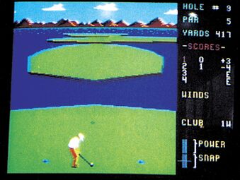 Daß die Sportspiele nach ihrem grandiosen Erfolg im Jahr 1985 auch 1986 noch ihre Daseinsberechtigung haben, zeigten bekannte Firmen wie SubLogic, Accolade und Access. Gerade Access überraschte nach ihren nicht zu Unrecht umstrittenen Erfolgen »Beach Head« und »Beach Head II« mit einer sehr guten 3D-Golfsimulation namens »Leader Board«. Das Programm war zur CES noch nicht ganz fertigestellt, einige Löcher des digitalen Golfplatzes konnten aber schon bespielt werden (Bild 5). Der Golfplatz wird wahlweise als Übersichtskarte oder aus der Perspektive des Spielers dargestellt. Die Simulation ist sehr realitätsgetreu, da vom Höhenunterschied bis zum Wind alles Wesentliche berücksichtigt wurde.