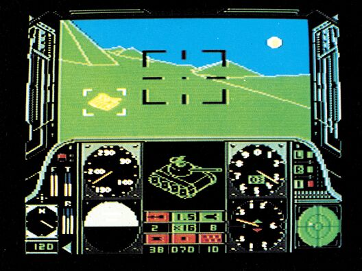 Eine weitere Simulation für den C 64 und auch Amiga ist »Gunship« von Microprose. Hier handelt es sich nicht, wie man vermuten könnte, um eine Schiffs-, sondern um eine Hubschrauber-Simulation, die sich allerdings recht kriegerisch gibt. Die C 64-Version (Bild 8) wird in Amerika jetzt schon verkauft, von der Amiga-Version war auf der CES ein Kurz-Demo zu sehen. Weiterhin zeigte Microprose »Acro Jet«, die Simulation eines Mini-Jets (Bild 9). Beide Programme weisen eine sehr schnelle 3D-Grafik auf, die bei »Gunship« den Ausblick aus dem Cockpit, bei »Acro Jet« hingegen Flugzeug und Landschaft von schräg oben zeigt.
