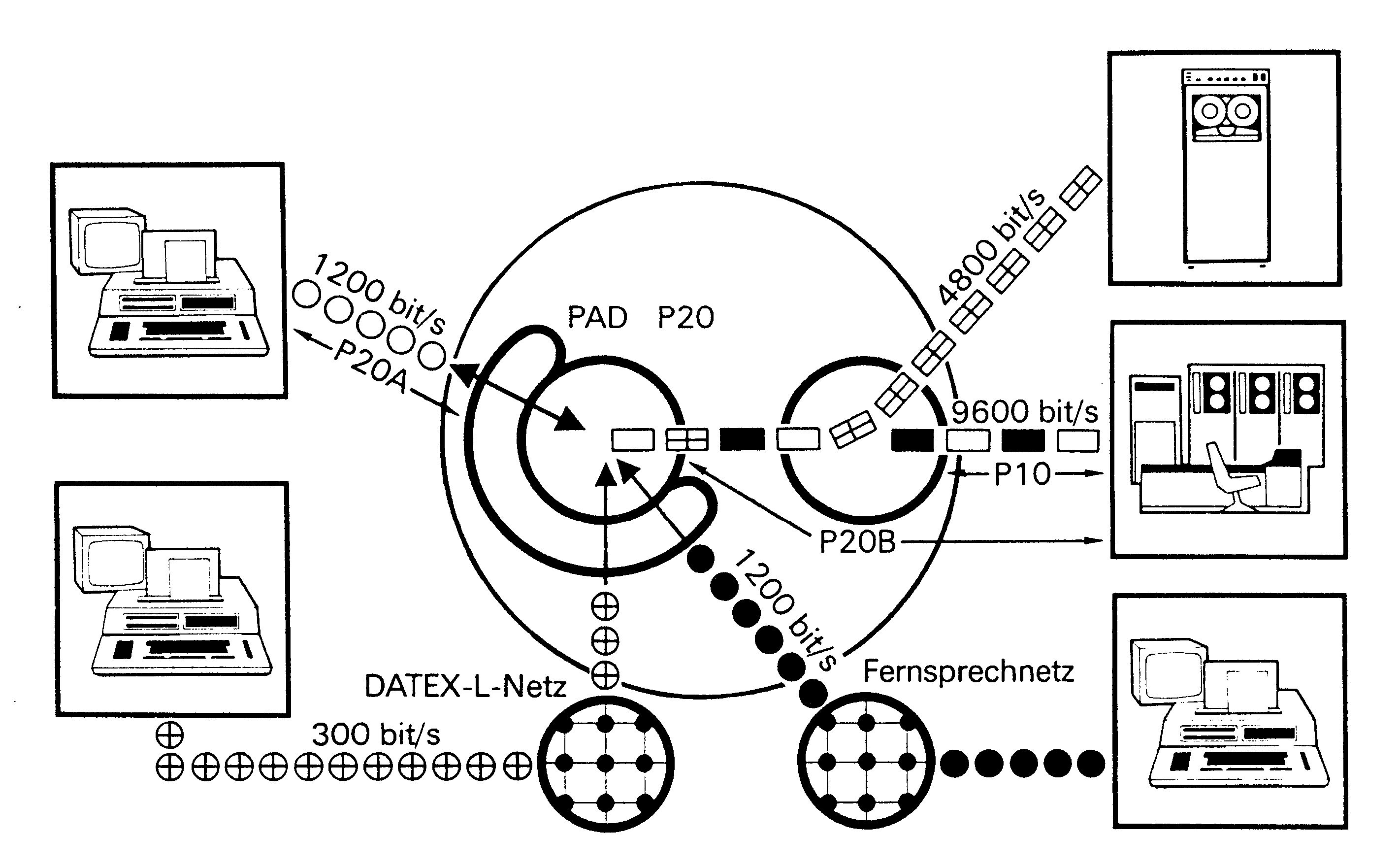 Der Unterschied zwischen den vier Datex-P-Arten liegt im Übertragungsprotokoll, der Art und Weise, mit der die Daten »auf die Reise geschickt werden«. Der Basisdienst P10 arbeitet nach der X.25-Norm mit den Übertragungsgeschwindigkeiten 2400, 4800, 9600 oder 48000 bit/s. Datex-P20 stattdessen mit einem X.28- und X.29-Protokoll mit Übertragungsgeschwindigkeiten von 110, 300, 1200, 1200/75 bit/s. Datex-P32 und Datex-P42 arbeiten nach der Norm bestimmter IBM-Computer (3271 oder 2770), die deshalb direkt als Datenendeinrichtung angeschlossen werden können. Was Datex-P so billig und deshalb interessant macht, ist die paketweise Übermittlung von Daten und die Kompatibilität von Datex-P zu ausländischen Kommunikationsnetzen (Bild 1). Kompatibilität heißt hier nicht, daß Datex-P und alle anderen Übermittlungsdienste gleichartig funktionieren, sondern daß die Post unterschiedliche Übertragungsprotokolle automatisch ineinander umwandelt, ohne daß der Benutzer etwas davon merkt (Bild 2).
