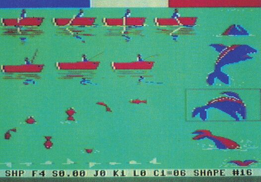 Im zweiten Schritt wird nun alles, was sich später bewegen soll, auf einem weiteren Multicolor-Bildschirm gezeichnet. Diesen Bildschirm muß man sich wie in Bild 2 möglichst günstig einteilen, damit alle Figuren in allen Bewegungsphasen darauf Platz haben. Die Einteilung kann nur in Rechtecken erfolgen. Ein solches Rechteck wird Shape genannt. Aus Platzgründen kann man also nur wenige animierte Objekte in verschiedenen Bewegungsphasen zeichnen. Als letztes definiert man noch die Bewegungssequenzen. In einer solchen Sequenz wird angegeben, welche Shapes zu einer Animation kombiniert werden sollen.