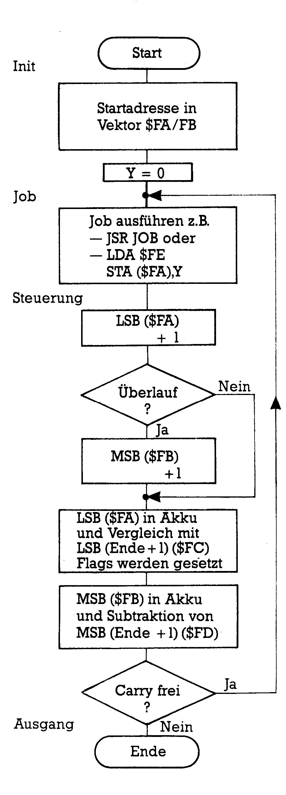 Schon in dem Beispiel zur Invertierung hatten wir die Startadresse als Vektor in zwei Zeropage-Speicherstellen geschrieben. Nun wird auch die Endadresse als Vektor $FC/FD gespeichert. So braucht nur im Initialisierungsteil von Aufgabe zu Aufgabe eine Änderung vorgenommen zu werden. Noch allgemeiner kann die Doppelschleife gestaltet werden durch eine Änderung des Jobteils. Handelt es sich beispielsweise um die Aufgabe, bestimmte Speicherbereiche zu beschreiben, dann kann auch der einzuschreibende Wert in eine Zeropage-Speicherstelle gepackt werden (hier in $FE). Will man allerdings auch die Art des Jobs offenhalten, dann verwendet man lediglich Sprünge in Unterprogramme. Der Jobteil heißt dann nur noch: