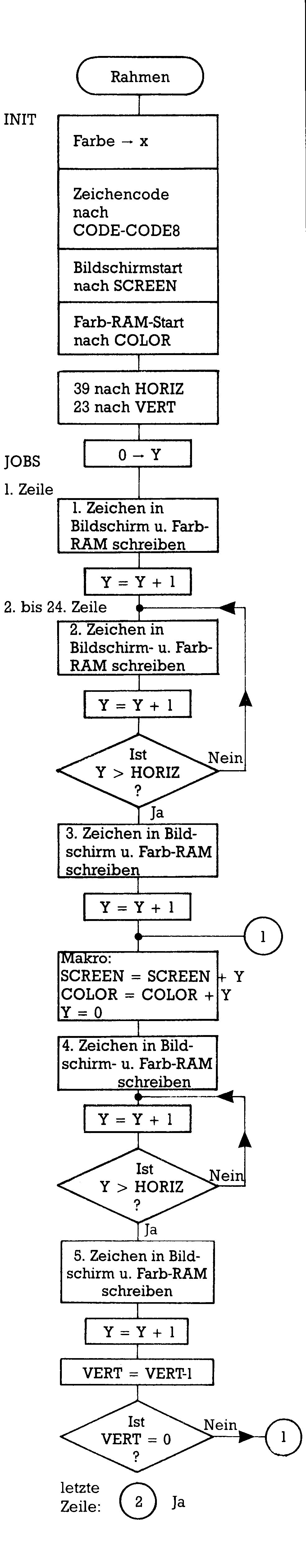 starten und der Rahmen wird bunt. Soll Ihr Rahmen aus anderen Zeichen bestehen? Kein Problem: Dann ändern Sie die Initialisierung oder POKEn Sie direkt in das Programm die neuen Codes hinein. Eine andere Rahmenfarbe wird gewünscht? Wieder können Sie durch POKE-Kommando oder Ändern der Initialisierung Ihre Farbe erzielen. Der Rahmen soll nur um die obere Bildschirmhälfte reichen? Dann verändern Sie einfach den Wert, der nach VERT geschrieben wird. Schwieriger wird es, wenn Sie auch HORIZ anders haben möchten. Nach dem Setzen des letzten Zeichens in eine Zeile müßte dann noch anstelle des INY eine Addition stehen, damit der Abstand zum ersten Zeichen der nächsten Zeile übersprungen wird. Vielleicht gibt Ihnen dazu die Antwort auf die nächste Frage einige Hilfen.