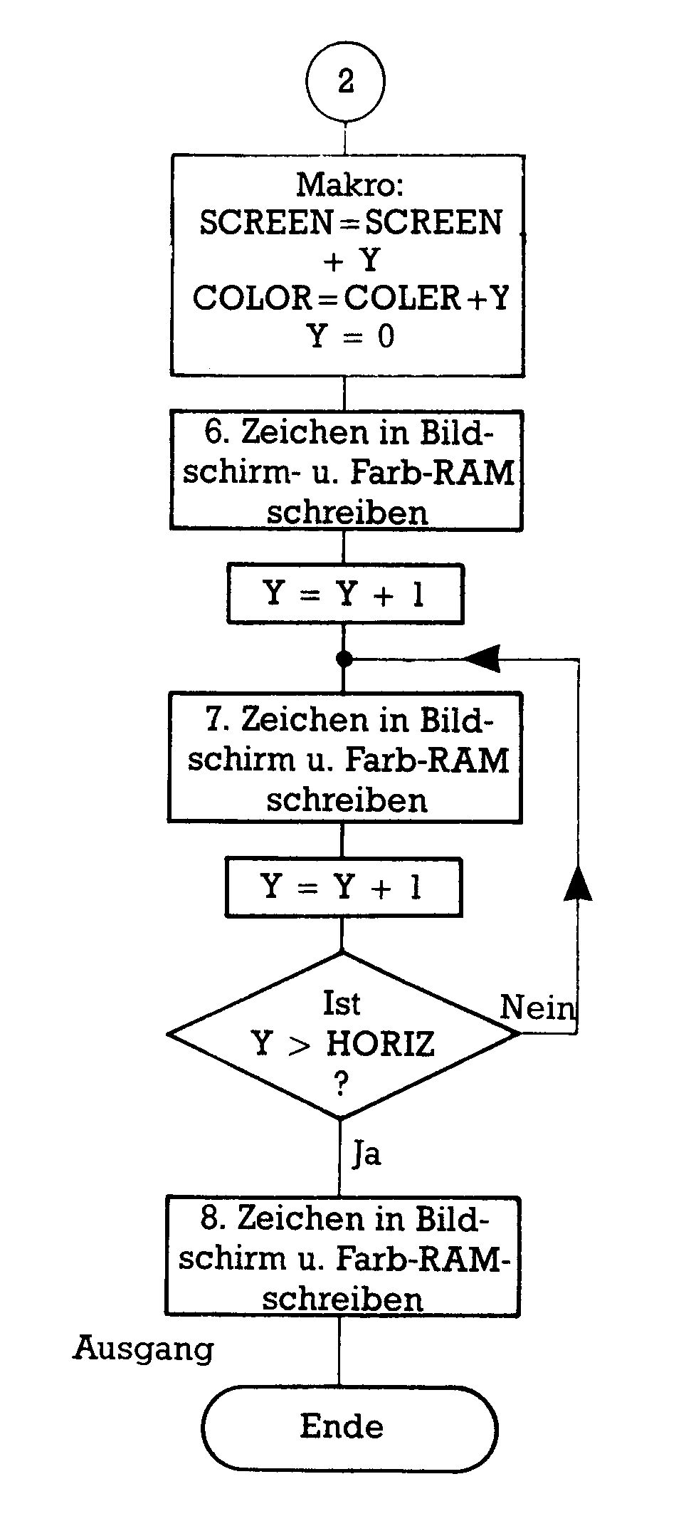 Zum Listing selbst muß sicher nichts mehr gesagt werden: Es ist ausführlich kommentiert und entspricht genau der oben im Flußdiagramm gezeigten Doppelschleife. Zum Starten dieses Maschinenprogrammes: Wenn Sie es einfach durch