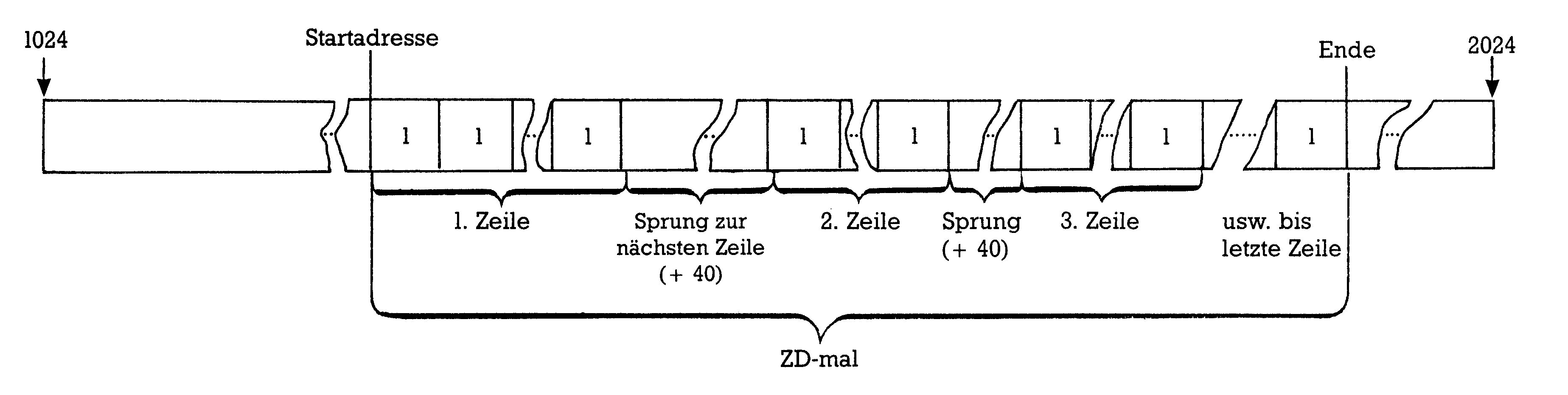 Die Startadresse berechnet sich aus der Bildschirmadresse SC (1024), der Zeilenzahl Zl-1, die jeweils mal 40 zu nehmen ist und der Spaltenzahl S1: