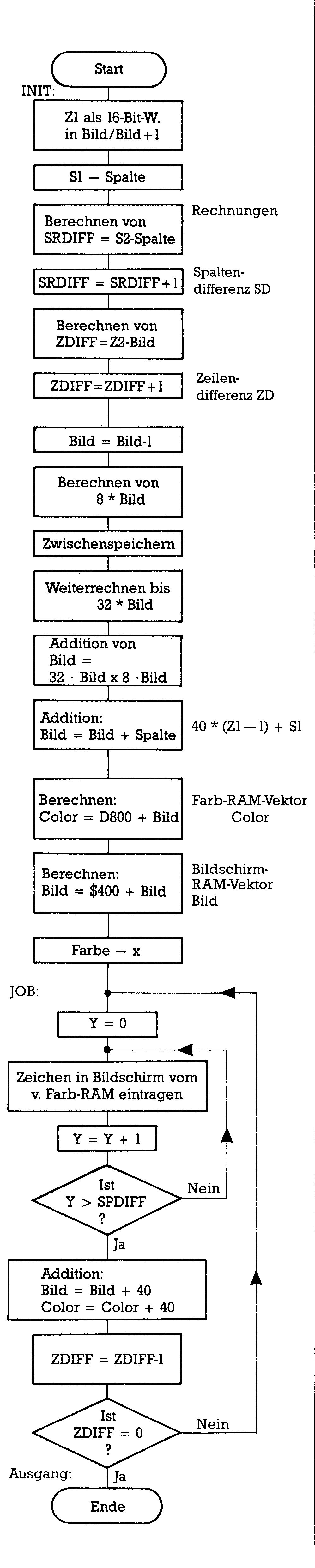 In unserem Programm beginnen wir diese Berechnung in Zeile 580. Dort wird zunächst sicherheitshalber das Carry-Bit-gelöscht für das erste ROL-Kommando. Durch DEC BILD erzeugen wir den Wert Zl-1 (nach BILD hatten wir ja Z1 geschrieben, BILD + 1 wurde reserviert für das MSB und eine Null eingetragen). Dreimaliges ASL BILD erzeugt 8*(Z1-1). Sie erinnern sich: Erst vom vierten ASL an mußte beim größten erlaubten Zl-Wert auch ROL eingesetzt werden. In den Zeilen 640/650 packen wir diesen Summanden in den Zwischenspeicher. Danach sind noch zwei ASL mit anschließenden ROL-Kommandos nötig, um in BILD/BILD +1 den Wert 32*(Z1-1) zu erzeugen. Von Zeile 690 bis 740 addieren wir beide Summanden und erhalten so 40*(Z1-1). Normalerweise muß vor jeder Addition mit ADC (denn das heißt ja »add with carry«, also addiere mit dem Carry-Bit, sogar addiere auch das Carry-Bit) das Carry-Bit durch CLC freigemacht werden. Hier können wir uns das aber ersparen, weil wir wissen, daß auch der größte Zl-Wert bei der letzten ROL- Operation nur eine Null ins Carry-Bit schieben konnte. Bei der folgenden Addition von S1 (Zeilen 760 bis 820) entsteht schließlich unser gewünschter Startwert — aber noch ohne Berücksichtigung der Anfangsadressen von Bildschirm- und Farb-RAM. Das kommt nun: Von Zeile 840 bis 900 entsteht im Vektor COLOR/COLOR + 1 der Zeiger auf die erste Farb-RAM-Stelle, von Zeile 920 bis 980 im Vektor BILD/BILD +1 schließlich der auf die erste Bildschirmspeicherstelle. Zum Abschluß dieser Programmphase schieben wir noch den Farbcode ins X-Register.