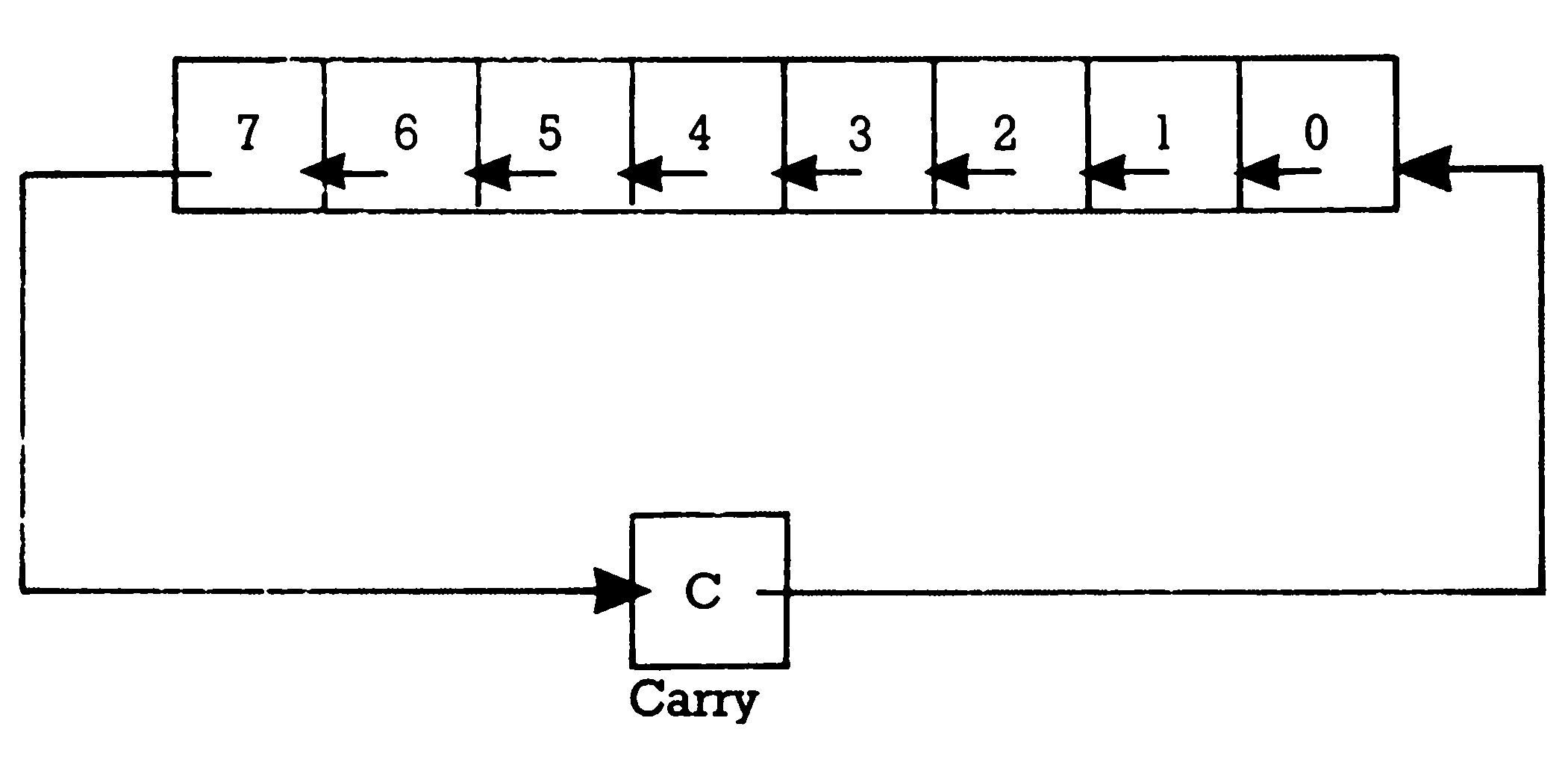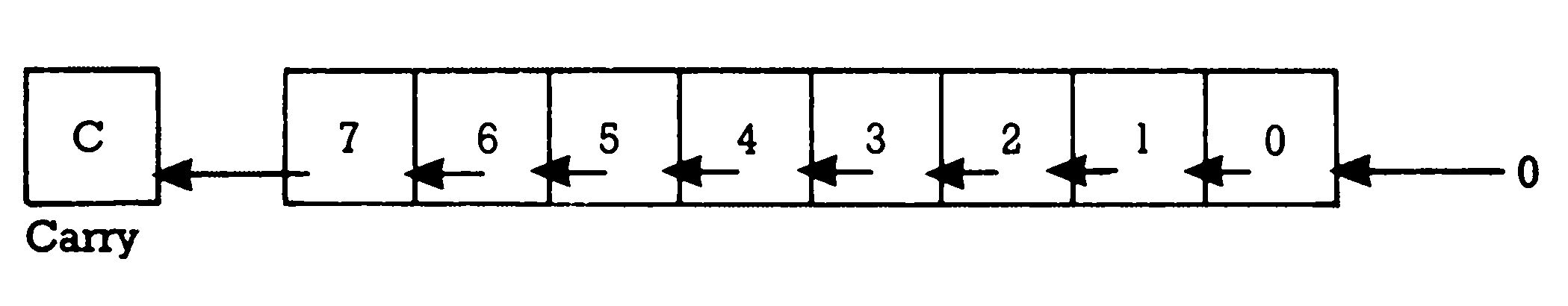 Vorsicht! Wenn wir nun nochmal die ASL-Operation anwenden, schieben wir das Bit 7 in das Carry-Bit. Das Ergebnis ist für eine 8-Bit-Zahl zu groß geworden, eine 16-Bit-Zahl ist vonnöten. Wir müßten dann die 1 aus dem Carry-Bit als Bit 0 des MSB verwenden können. Das wird mit ROL (rotate left = nach links rotieren) möglich. Auch verschiebt der Befehl jedes Bit um eine Stelle nach links. Als neues Bit 0 aber tritt der Inhalt des Carry-Bit ein. Parallel dazu wandert das Bit 7 ins Carry-Bit. Der weitere Weg in unserem Beispiel muß nun also lauten: