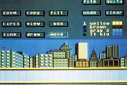 Der SceneMaker (Bild 1), mit dem sich die Hintergrundgrafiken zeichnen lassen, ist ein einfaches Malprogramm, das alle wichtigen Funktionen enthält. Einen Nachteil muß man aber in Kauf nehmen: Es dürfen auf einem Bild immer nur vier verschiedene Farben auftauchen, die man aus der üblichen Palette von 16 Farben auswählen kann. Die Bedienung ist, wie auch in allen anderen Programmteilen, sehr komfortabel. Die Tastatur wird nur zum Eingeben des Filenamens beim Speichern eines Bildes verwendet. Alles andere wird durch den Joystick gesteuert. Etwa sumständlich ist das Einfügen von Text ins Bild: Der SceneMaker enthält nämlich keine Text-Funktion. Das Handbuch schlägt unter der Rubrik »Tips & Tricks« folgende Verfahrensweise vor: Malen Sie das Bild ohne den Text, geben dann im Programmeditor mit Print-Befehlen den Text auf dem Bildschirm aus, gehen wieder zurück in den SceneMaker und speichern das nun fertige Bild.