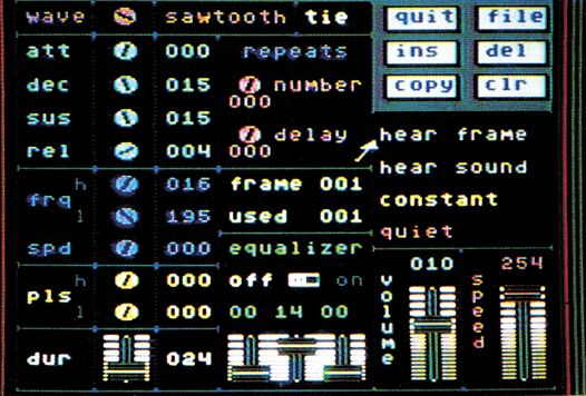 Der SoundMaker (Bild 3) ist ein kleines Synthesizer-Programm, das sich nicht zum Komponieren von Musikstücken, sondern nur von Sound-Effekten eignet. Ein Effekt kann aus verschiedenen Einzeltönen zusammengesetzt werden. Dabei ist die volle Kontrolle über den SID-Chip gegeben. Mit dem Joystick verstellt man Dreh- und Schieberegler, um von der Explosion bis zum Tarzan-Schrei die wildesten Geräusche zu erzeugen.