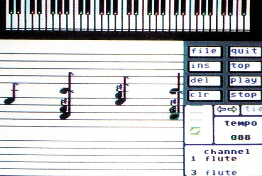 Anders aufgebaut ist der MusicMaker (Bild 4). Hier stehen nur 13 Klangfarben verschiedener Instrumente zur Verfügung, die dann in dreistimmigen Liedern eingesetzt werden können. Auch hier gilt: Fast alles wird mit dem Joystick gesteuert. Wie bei nahezu jedem Kompositionsprogramm üblich, werden Noten auf einem Notenblatt plaziert. Schade also, daß man von einem Programmierer musikalische Kenntnisse verlangt. Man hätte viel lieber nach einer Möglichkeit der Eingabe suchen sollen, die ohne Noten auskommt. Andererseits kann man so fertige Musik-Stücke »abtippen«.