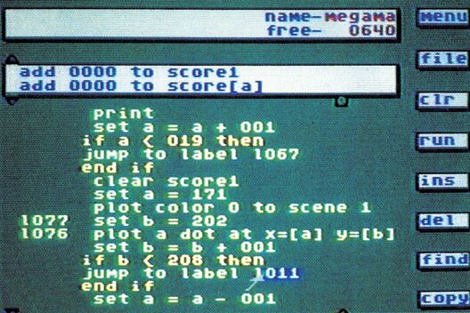 Bei einem GameMaker-Listing (Bild 5) fällt als erstes auf, daß es keine Zeilennummern gibt. Um die vorhandenen Sprungbefehle (ähnlich GOTO und GOSUB) zu nutzen, muß man Labels vergeben. Ein Label besteht aus einer dreistelligen Nummer. Diese Nummer an sich ist nicht sehr aussagekräftig, so daß man als Programmierer ständig eine Liste führen sollte, welches Label auf welche Routine weist. Die Labels werden übrigens ausgerückt, das Listing wird dadurch und durch eine gute Farbwahl sehr übersichtlich. Zur Datenspeicherung benötigt man Variablen. Derer gibt es genau 26, von »a« bis »z« bezeichnet. Jede Variable kann einen Wert zwischen 0 und 255 annehmen. Außerdem gibt es zwei Score-Variablen, die Punktzahlen bis 999999 speichern können. Diese Score-Variablen werden vollautomatisch auf den Bildschirm abgebildet, wenn sich die Punktzahl ändert. Die Position dieser Punkteanzeige ist frei bestimmbar. Dies ist nur eines von vielen Programmierdetails, die die Arbeit mit GameMaker vereinfachen.